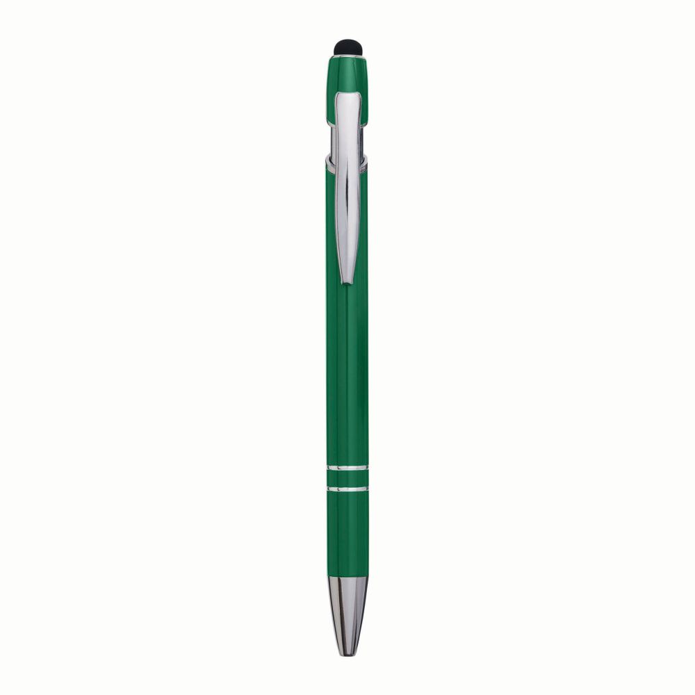Hliníková propiska - kuličkové pero s lesklým kovovým tělem, tlačítkovým mechanismem, stylusem na displeje a s modrou náplní. Rozměry: 14,2 cm