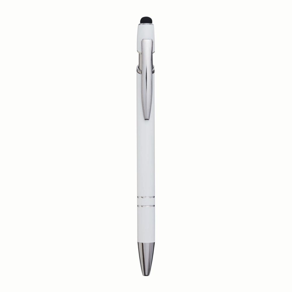 Hliníková propiska - kuličkové pero s lesklým kovovým tělem, tlačítkovým mechanismem, stylusem na displeje a s modrou náplní. Rozměry: 14,2 cm
