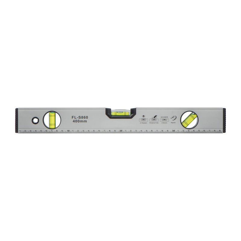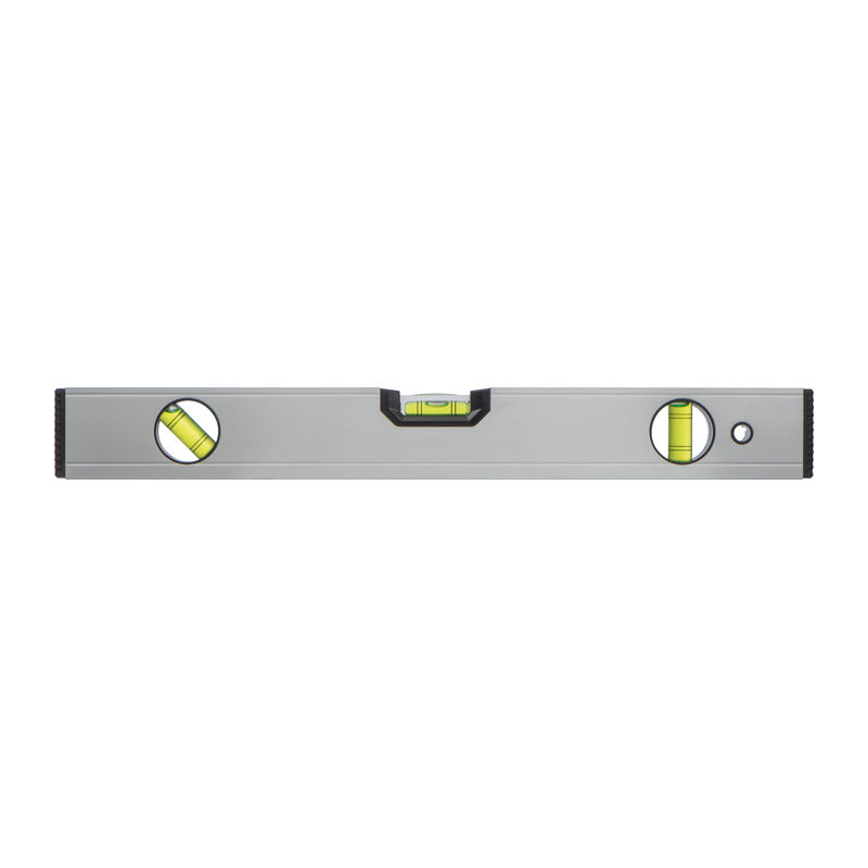 Hliníková vodováha se třemi libelami (horizontální, vertikální a 45°), magnetickou základnou a 40 cm stupnicí. Rozměry: 40 x 2,1 x 4,9 cm