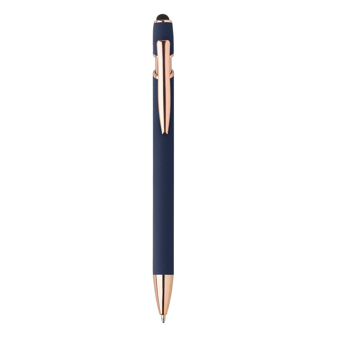 Hliníkové kuličkové pero s detaily v barvě růžového zlata a s gumovým stylusem pro kapacitní displeje. Kuličkové pero obsahuje modrou náplň. Rozměry: O 1 × 14,1 cm.