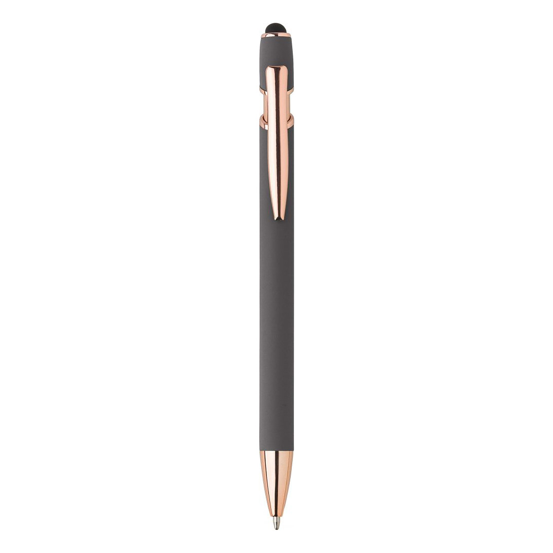 Hliníkové kuličkové pero s detaily v barvě růžového zlata a s gumovým stylusem pro kapacitní displeje. Kuličkové pero obsahuje modrou náplň. Rozměry: O 1 × 14,1 cm.