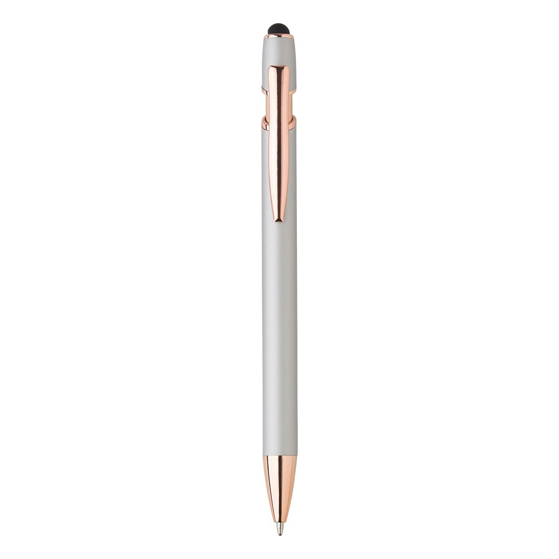 Hliníkové kuličkové pero s detaily v barvě růžového zlata a s gumovým stylusem pro kapacitní displeje. Kuličkové pero obsahuje modrou náplň. Rozměry: O 1 × 14,1 cm.