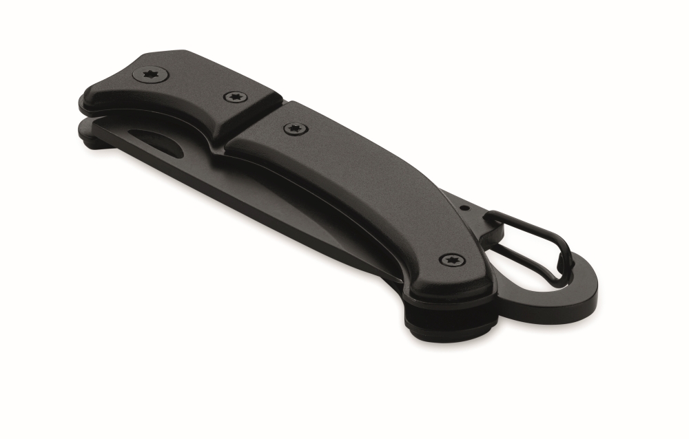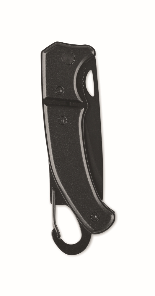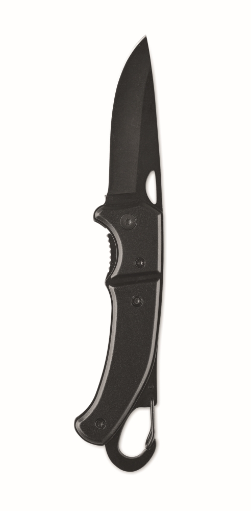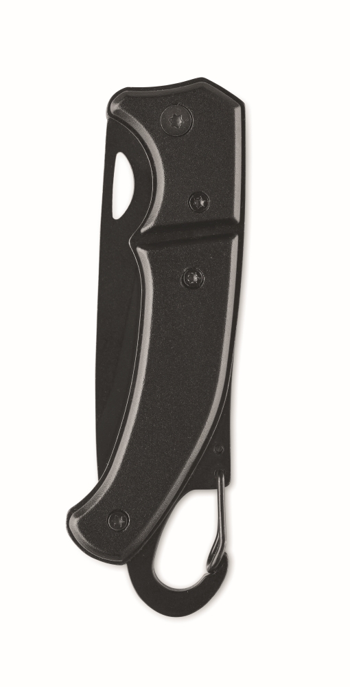 Hliníkový zavírací nůž s karabinou. Čepel z nerezové oceli. Karabina není určena pro horolezectví (pouze neprofesionální použití). Rozměry: 10 x 3 x 1 cm. Materiál: hliník