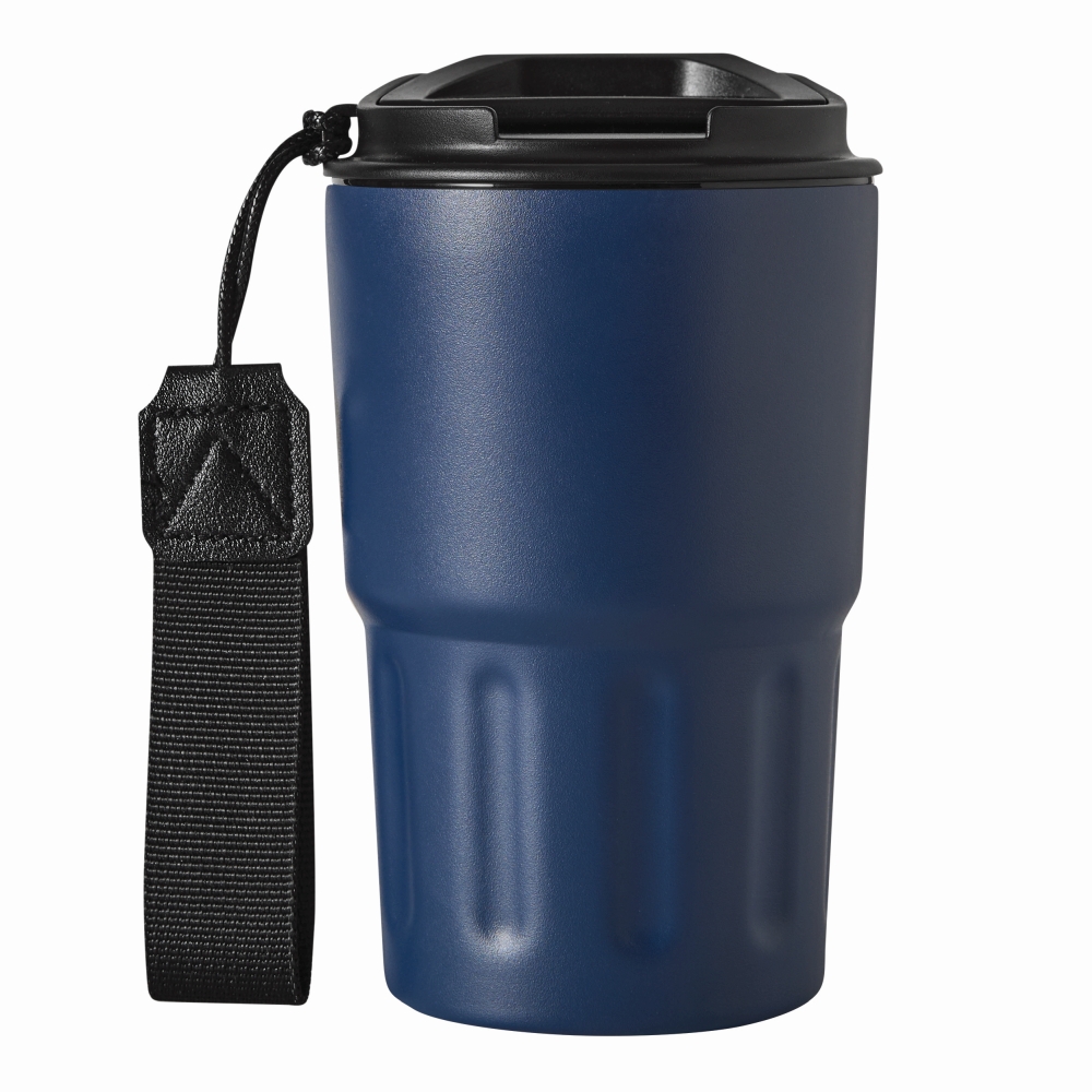 Izolovaný hrnek, dvoustěnný: uvnitř i vně z nerezové oceli, matný práškový lak, plastové víčko s bezpečným šroubovacím uzávěrem, silikonové těsnění a integrovaný otvor na pití, kapacita cca. 400 ml, poutko na zápěstí z recyklovaného plastu. Rozměry: O8,8 x 14,7 cm