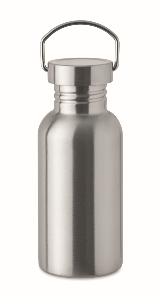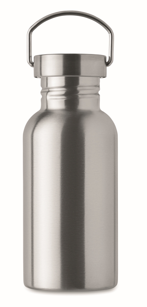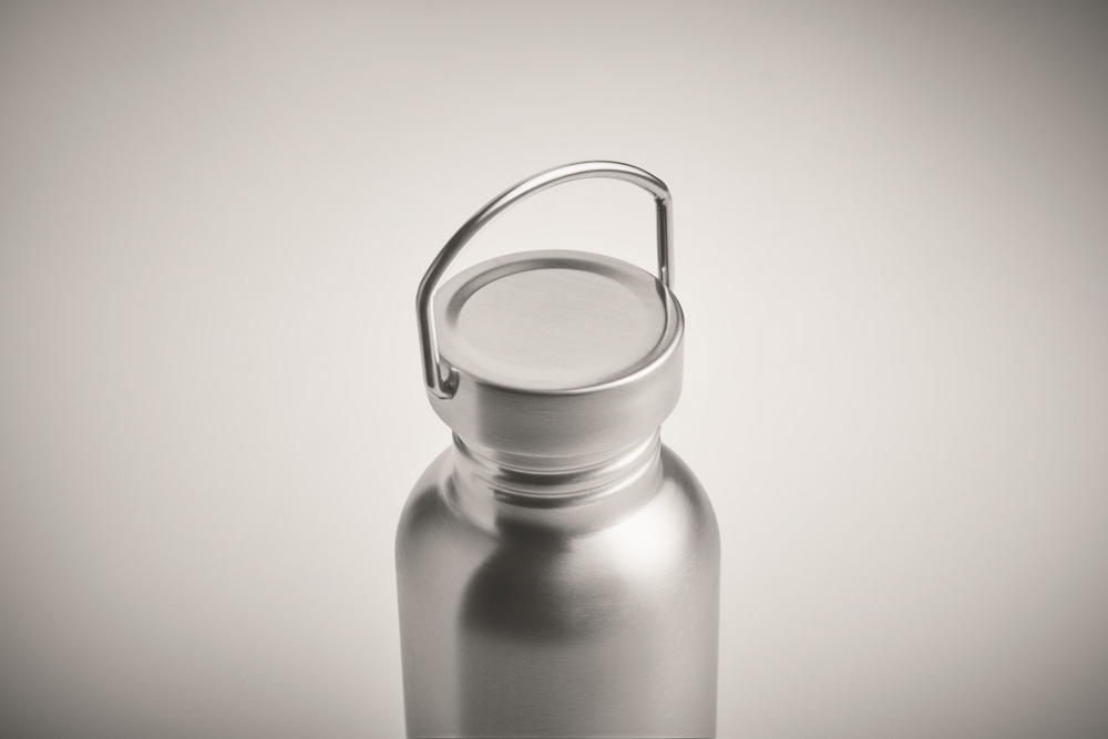 Jednostěnná láhev z recyklované nerezové oceli (90 % recyklovaná nerezová ocel a 10 % nerezová ocel) s víčkem s rukojetí. Neteče. Objem: 500 ml. Rozměry: O 7 x 18 cm