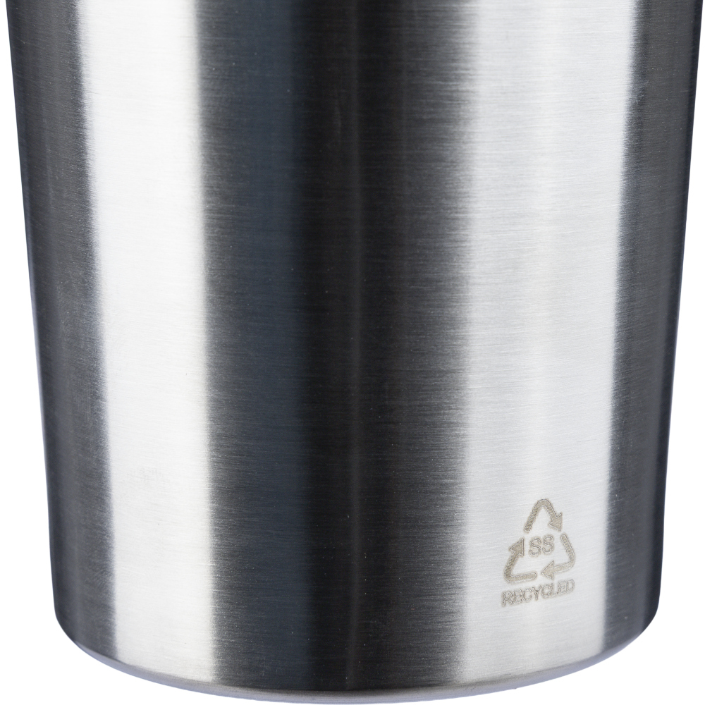 Sportovní láhev na pití z recyklované nerezové oceli (750 ml), jednostěnná. Má šroubovací víčko z PP a kovovou třepačku pro míchání. Na přední straně je laserem gravírované recyklované logo. Jednotlivě baleno v krabičce z kraftového papíru. Rozměry: 8 x 23 cm