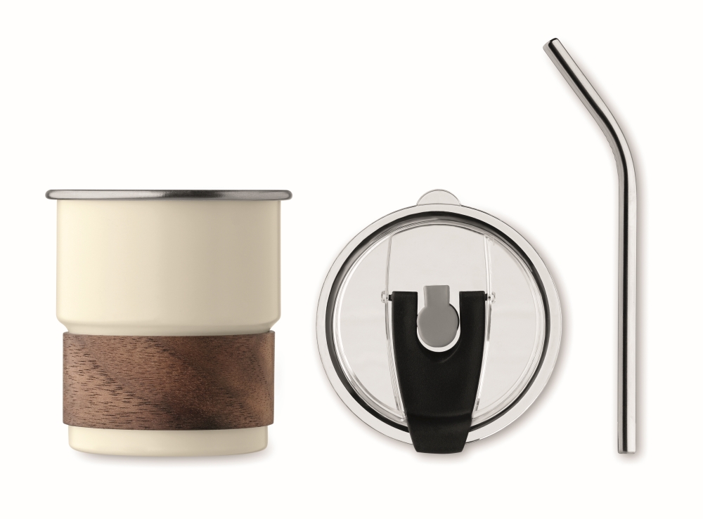 Jednostěnný pohárek z recyklované nerezové oceli (90 % recyklované nerezové oceli a 10 % nerezové oceli) s odnímatelným úchytem z akáciového dřeva. Víčko s pítkem a nerezovým brčkem. Objem: 260 ml. Rozměry: O 8 x 9 cm