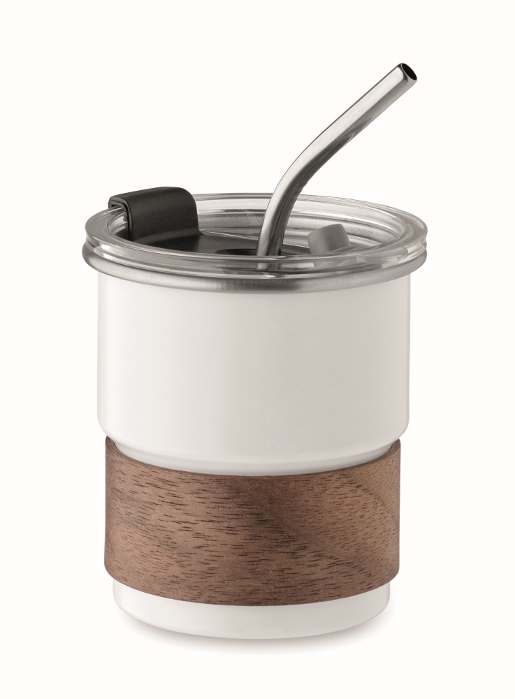 Jednostěnný pohárek z recyklované nerezové oceli (90 % recyklované nerezové oceli a 10 % nerezové oceli) s odnímatelným úchytem z akáciového dřeva. Víčko s pítkem a nerezovým brčkem. Objem: 260 ml. Rozměry: O 8 x 9 cm