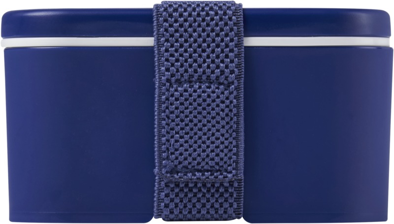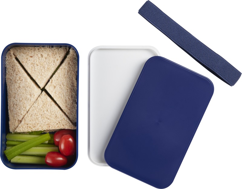 Plastová obědová krabička s víčkem upevněným páskem z recyklovaného plastu. Objem krabičky je 700 ml. Vhodná do mikrovlnné trouby a myčky nádobí. Neobsahuje BPA. Rozměry: 18 × 11 × 6 cm.