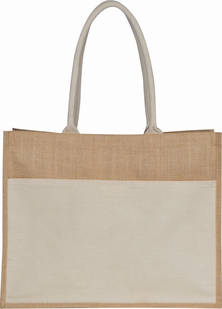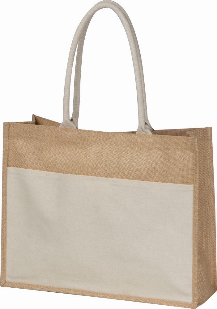 Jutová nákupní taška s certifikátem Oeko-Tex® STANDARD 100 se dvěma uchy na nošení, s praktickou bavlněnou kapsou na přední straně se zavíráním na suchý zip. Rozměry: 45 x 15 x 36 cm