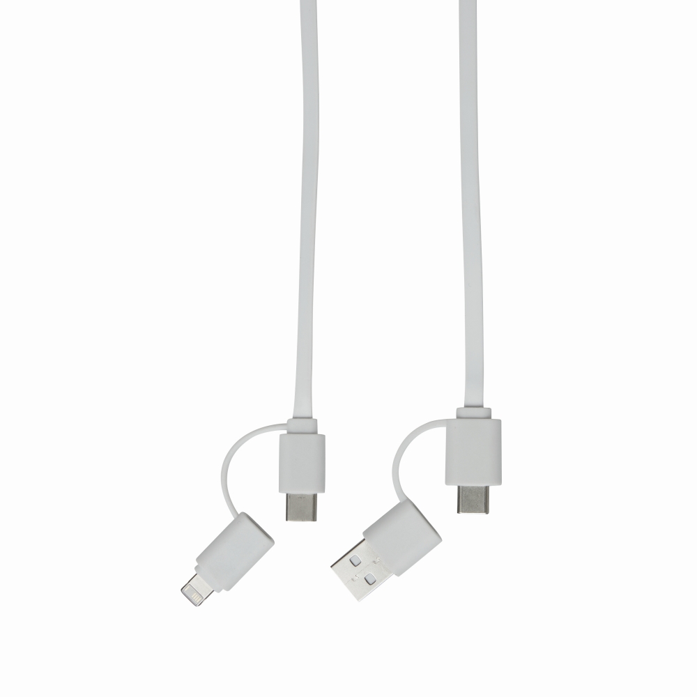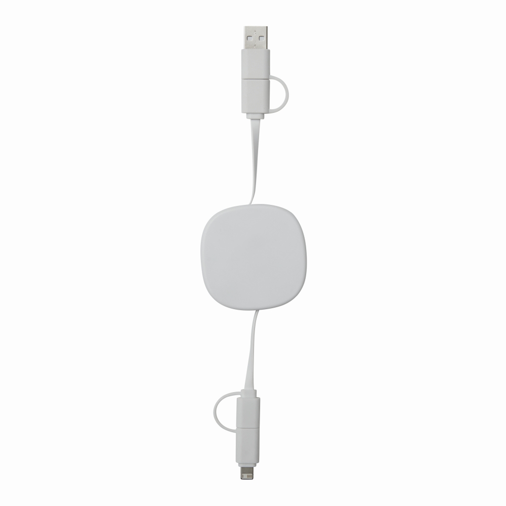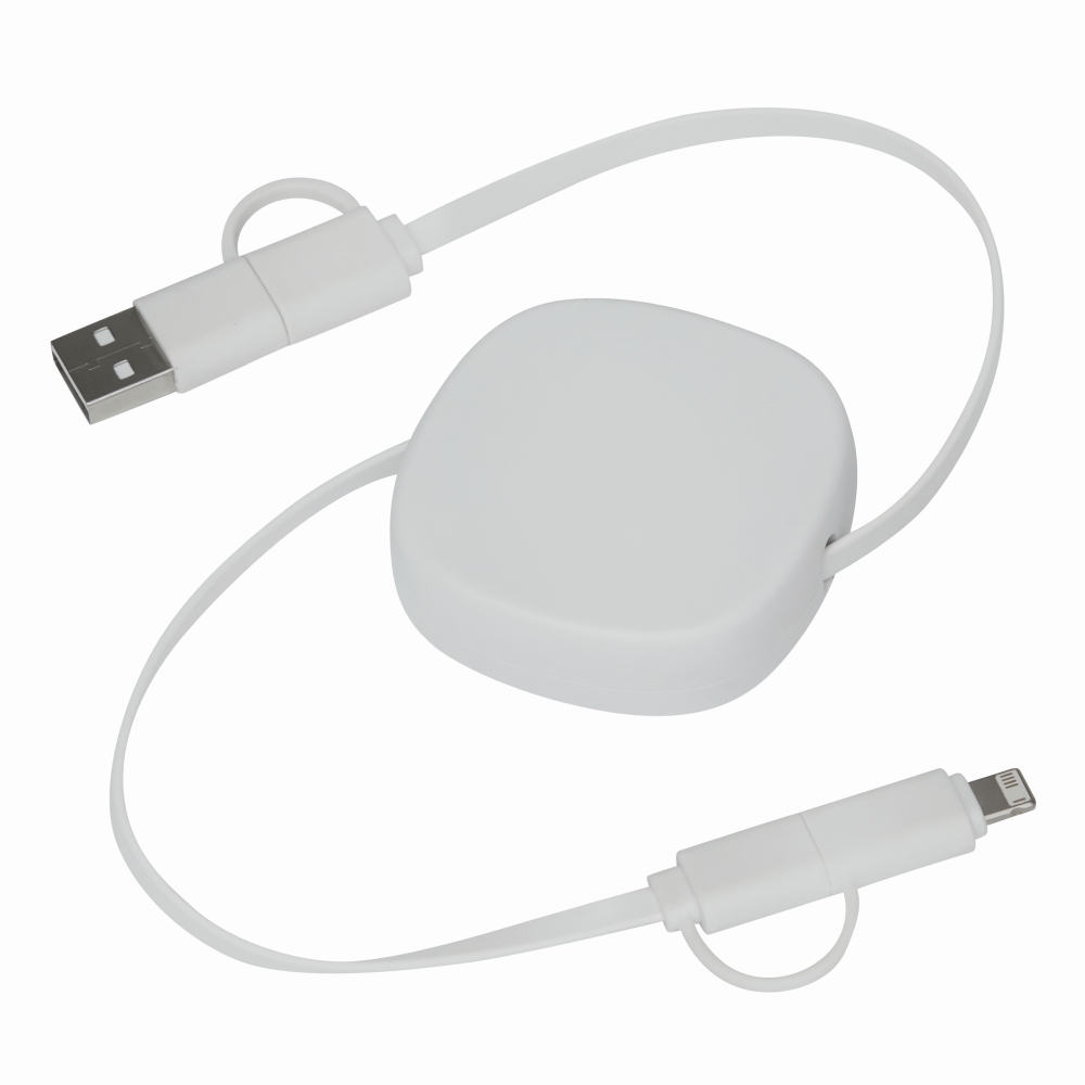 Kabel pro nabíjení a přenos dat, zatahovací (délka cca 92 cm), k nabíjení elektronických zařízení včetně notebooků (příkon 65 W) a také k přenosu dat s kombinovaným typem USB- Vstupní konektor A / Type-C a kombinovaný konektor USB-C / Micro-USB / Lightning. Rozměry: 5 x 5 cm
