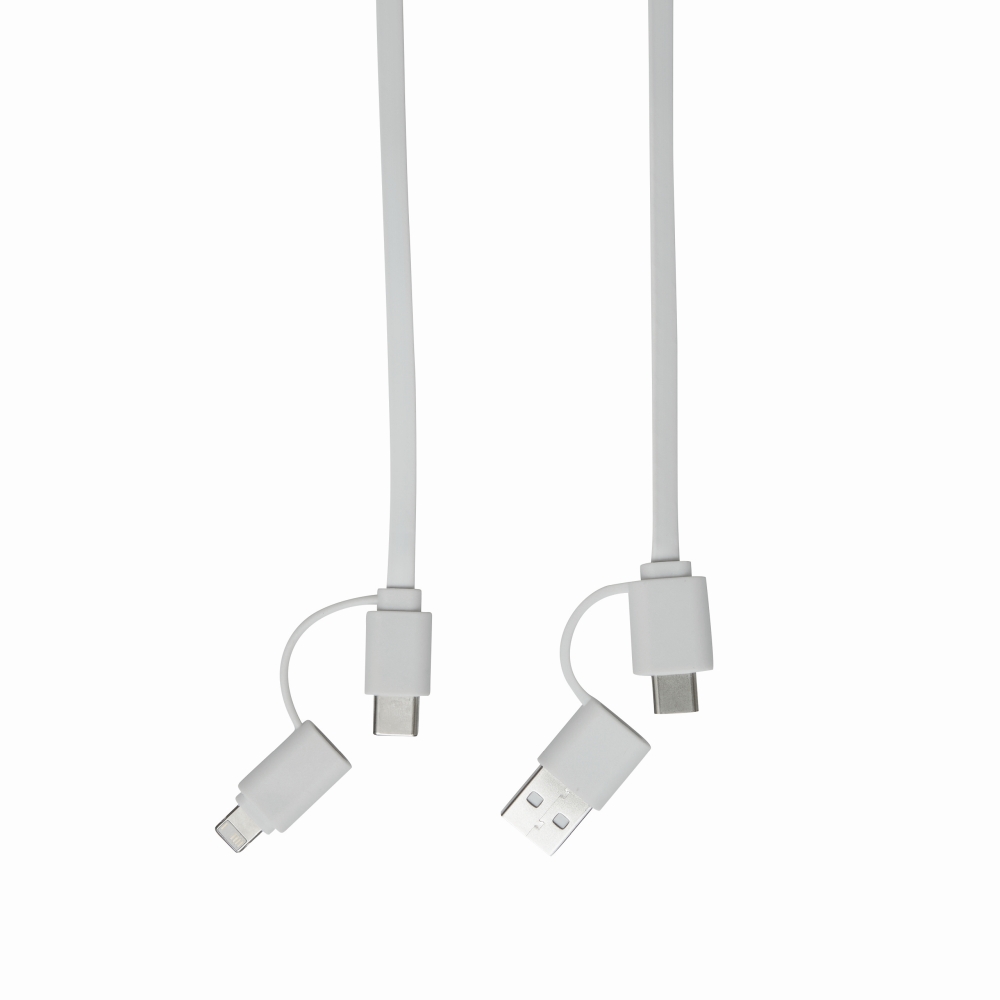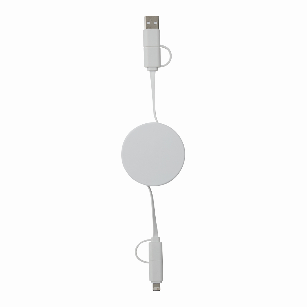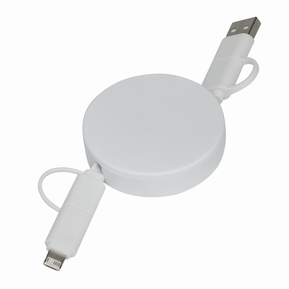 Kabel pro nabíjení a přenos dat, zatahovací (délka cca 92 cm), k nabíjení elektronických zařízení včetně notebooků (příkon 65 W) a také k přenosu dat, s kombinovaným typem USB- Vstupní konektor A / Type-C a kombinovaný konektor USB-C / Micro-USB / Lightning. Rozměry: O5,1 cm