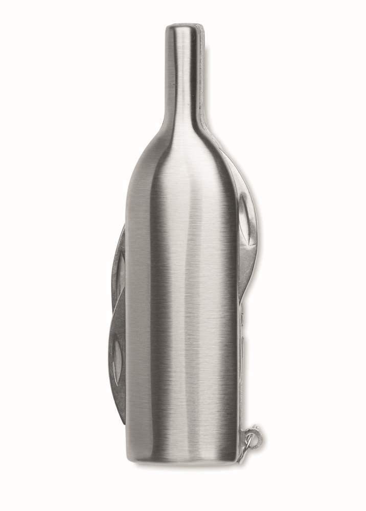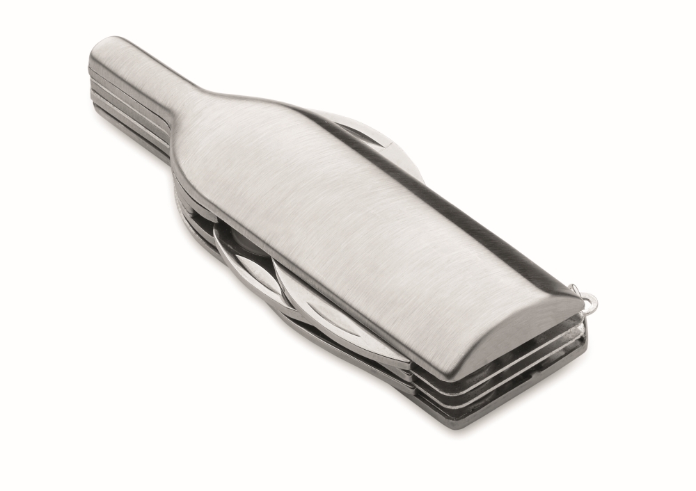 Kapesní nůž z nerezové oceli ve tvaru láhve se 4 funkcemi: otvírák na láhve, nůž, vývrtka a klíčenka. Rozměry: 10 x 2,5 cm. Materiál: recyklovaný papír