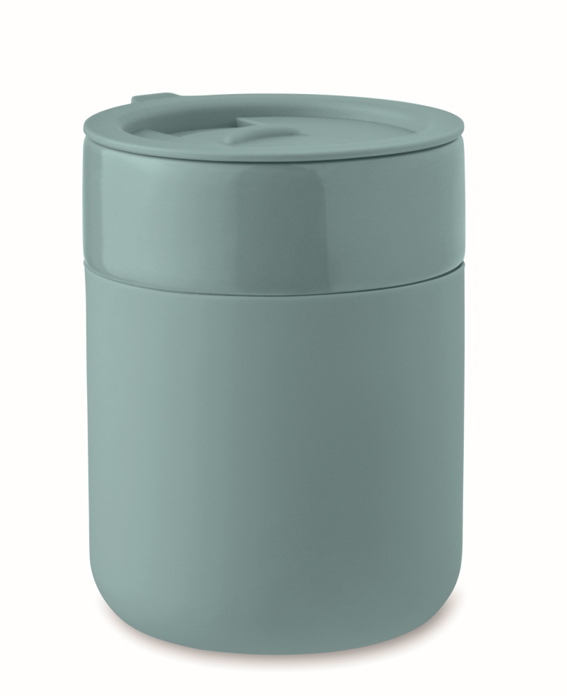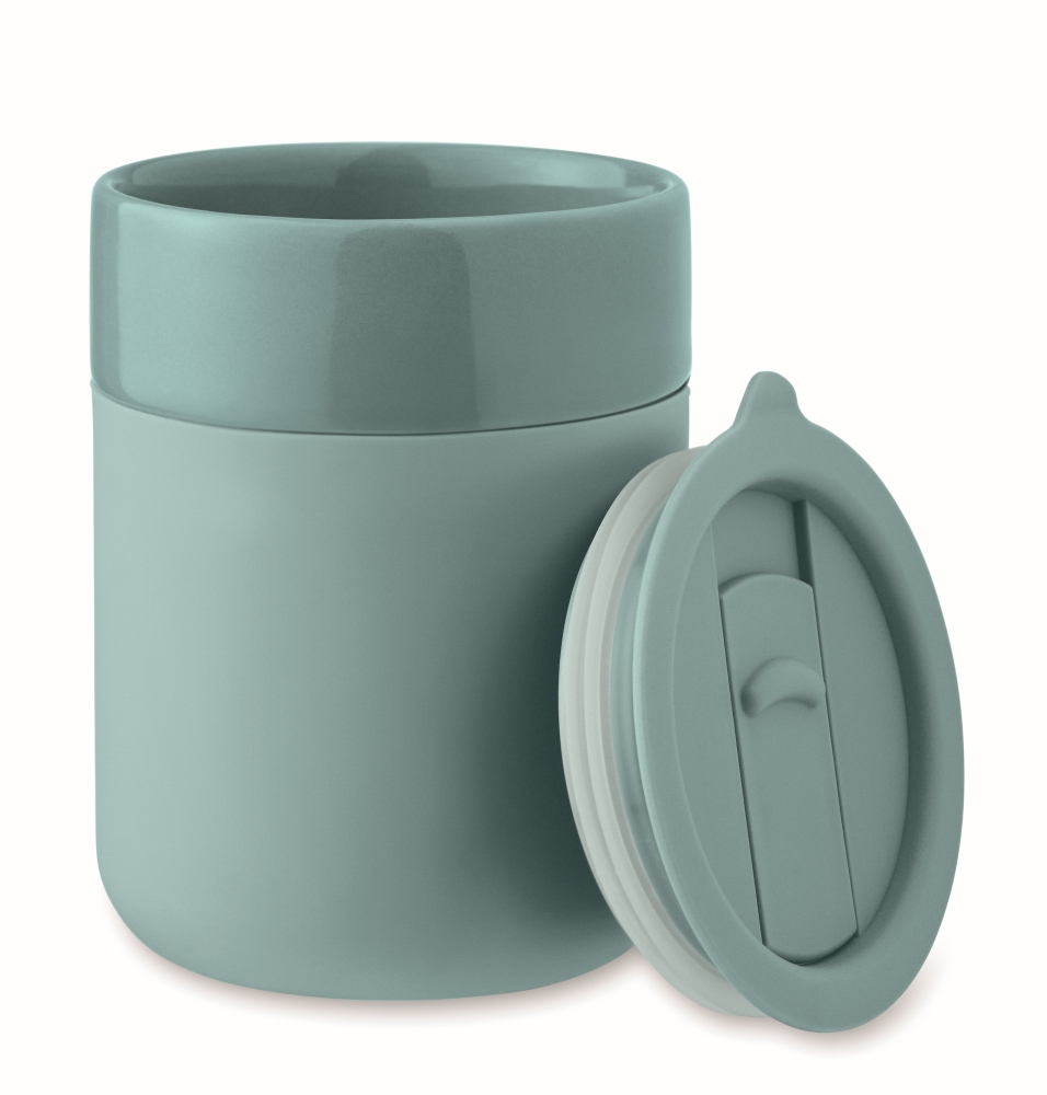Keramický pohárek se silikonovým odnímatelným návlekem a víčkem z PP. Objem: 330 ml. Rozměry: O 8,1 x 11 cm
