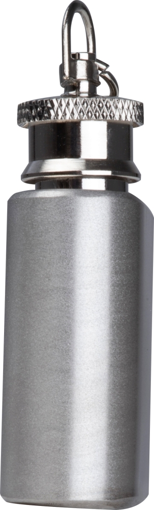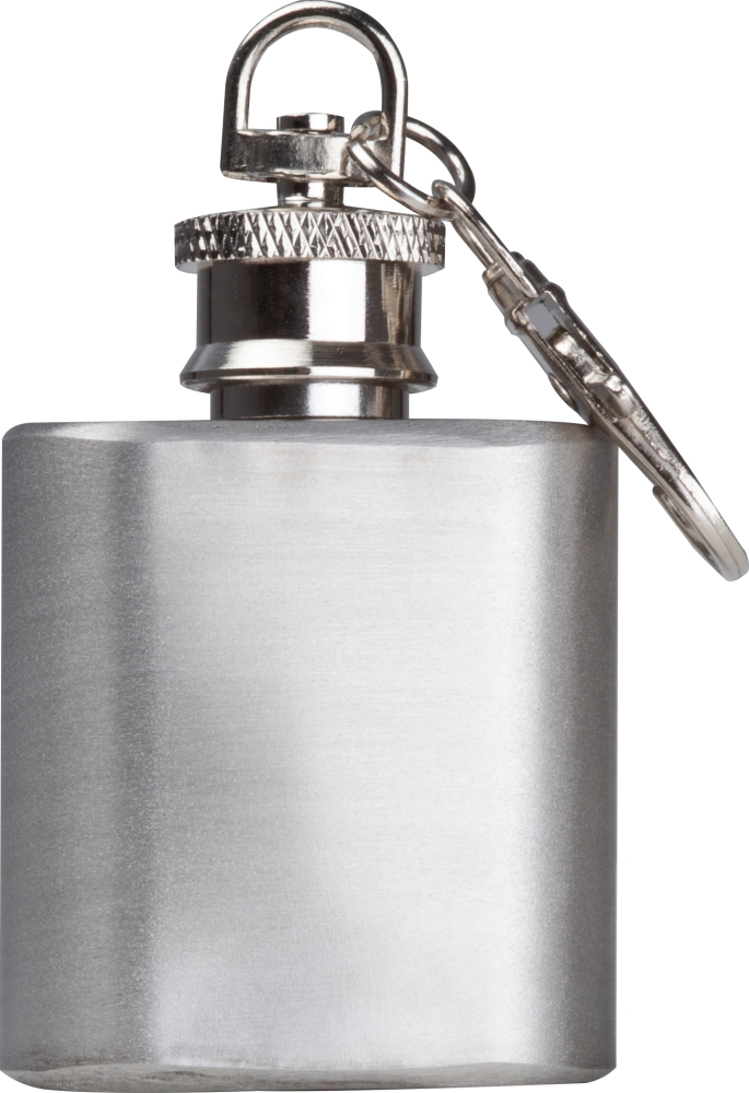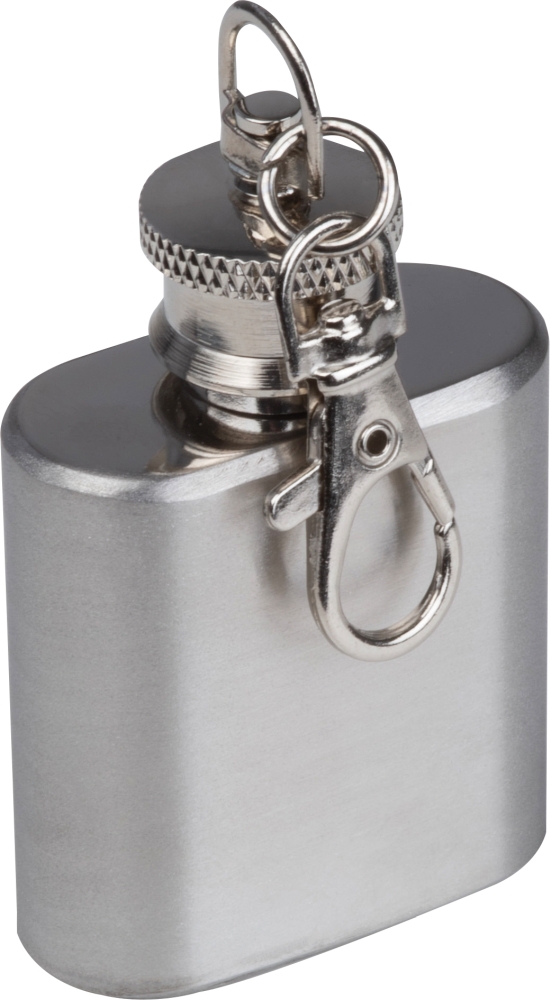 Mini nerezová lahvička na klíče o objemu 30 ml a závitovým víčkem. Rozměry: 3,9 x 2 x 6,3 cm