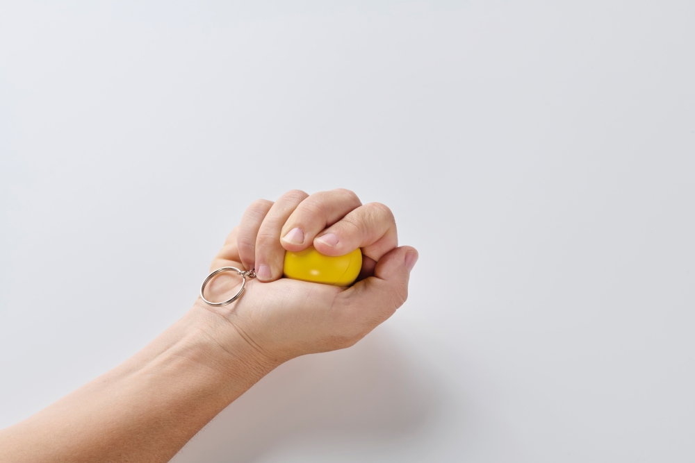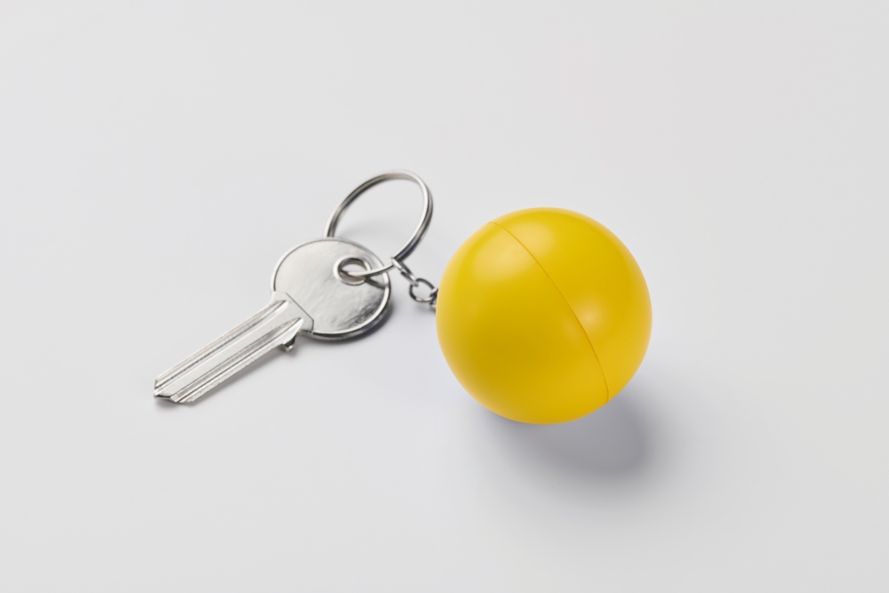 Klíčenka ve tvaru kuličky z PU. Rozměry: O 4 cm