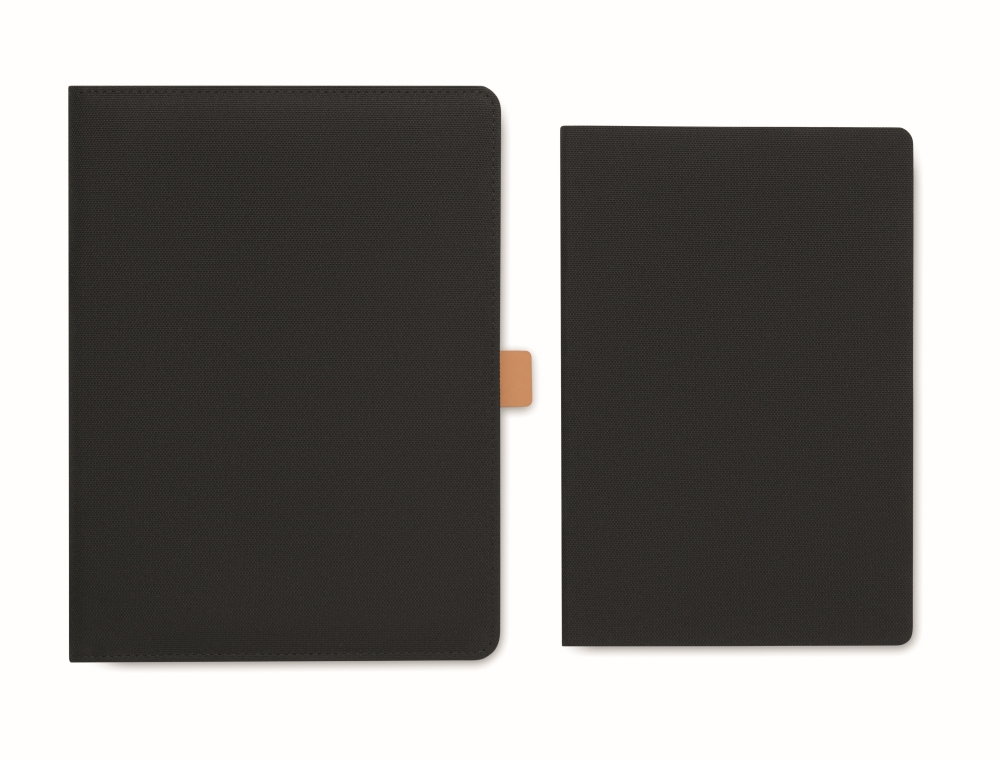Portfolio A5 z RPET s detaily z umělé kůže. Vyměnitelný zápisník A5 s tvrdými deskami. 128 linkovaných stránek z recyklovaného papíru (64 listů). Držák na pero. 2 pouzdra na karty a jedna velká přihrádka. Elastický pásek s kovovým detailem. Rozměry: 17,5 x 2 x 23 cm. Materiál: RPET