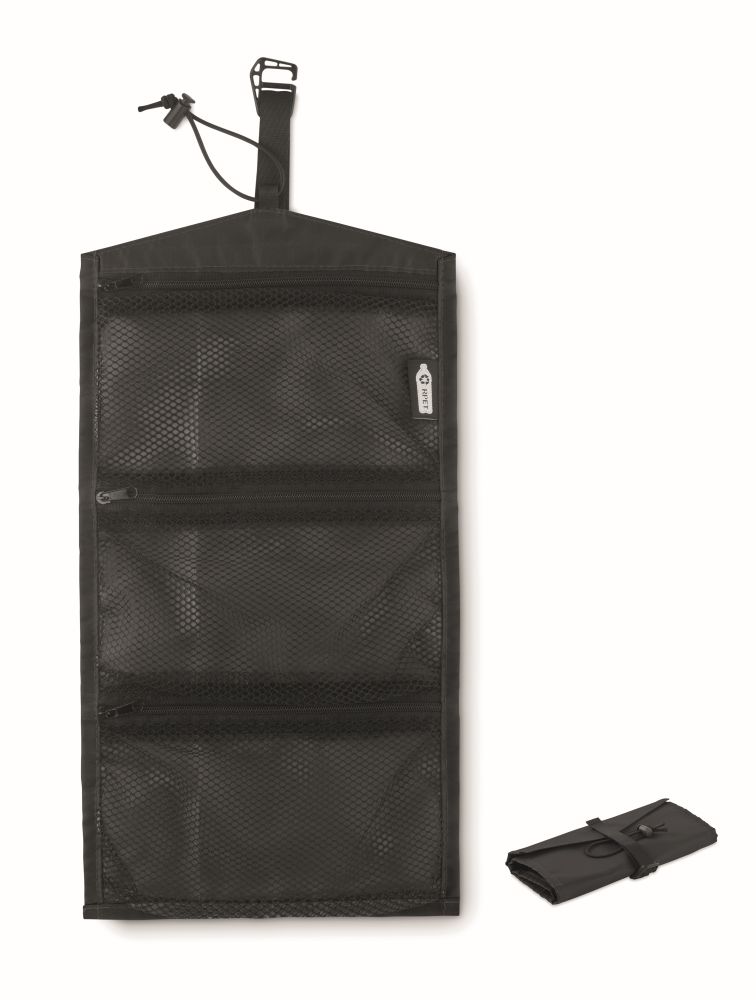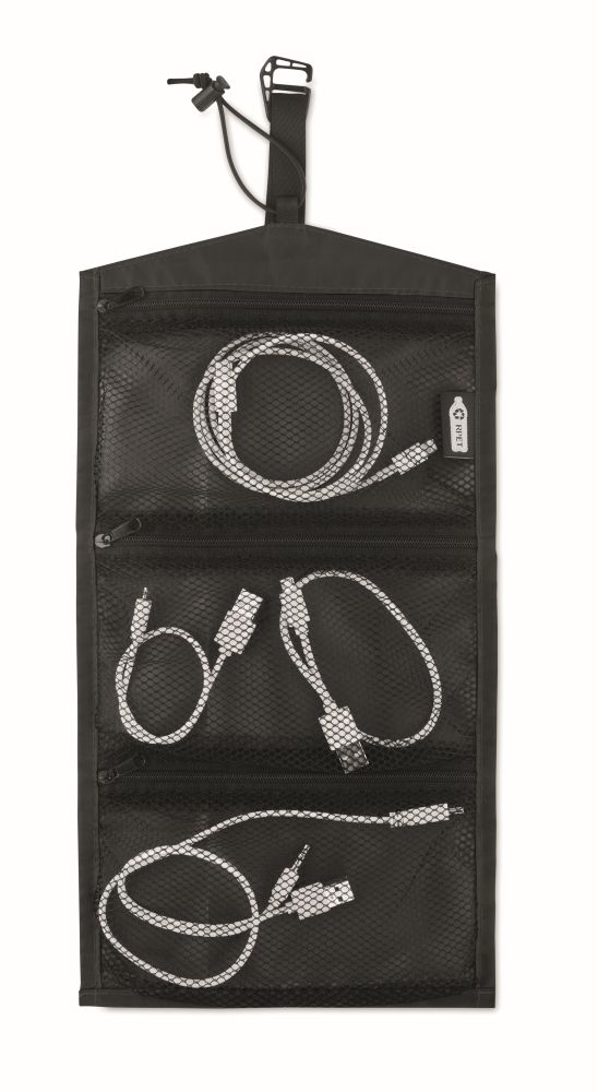 Rolovací organizér na kabely z materiálu 210D RPET. 3 přihrádky na zip. Tuto brašnu lze použít i jako kosmetickou tašku. Rozměry: 19.5x36.5cm