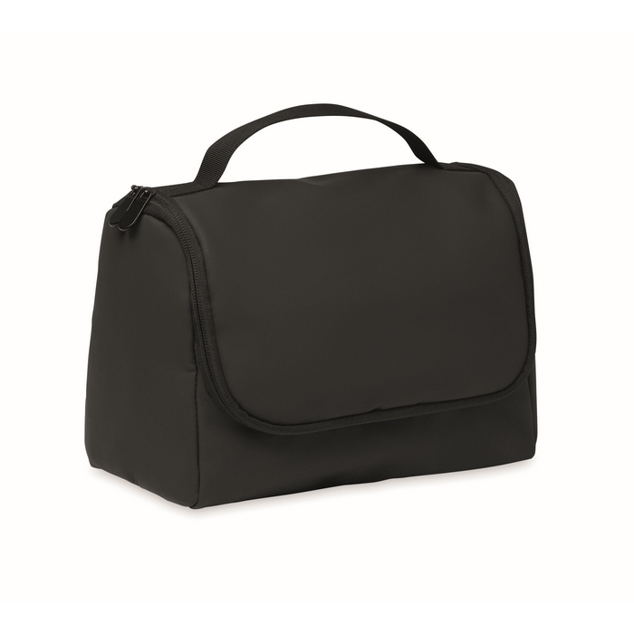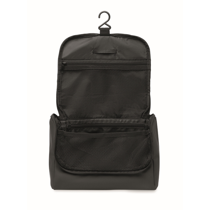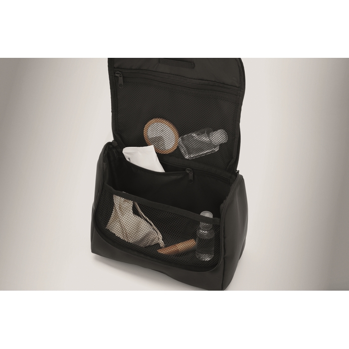 Kosmetická taška z měkkého PU s háčkem na zavěšení a podšívkou z materiálu 210D RPET. Jedna velká hlavní přihrádka s vnitřní přihrádkou ze síťoviny na zip a 1 přihrádka ze síťoviny.Rozměry: 26 x 15 x 18cm