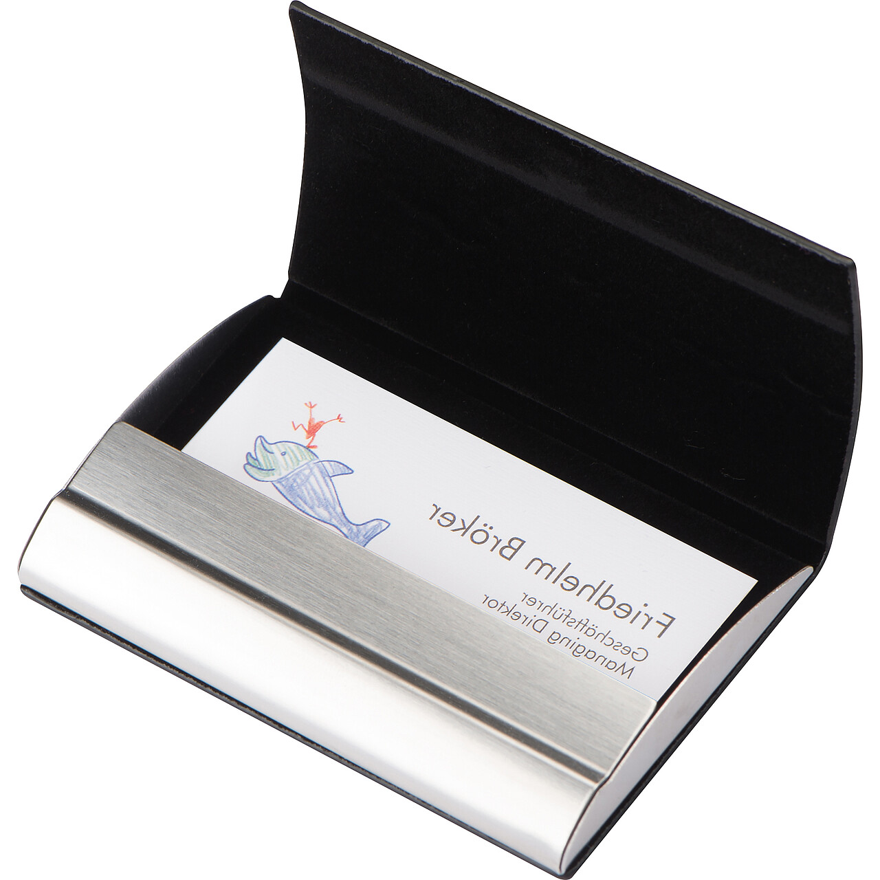 Kovový vizitkář s povrchem z umělé kůže a s magnetickým zavíráním. Rozměry: 9,7 × 6,4 × 1,5 cm