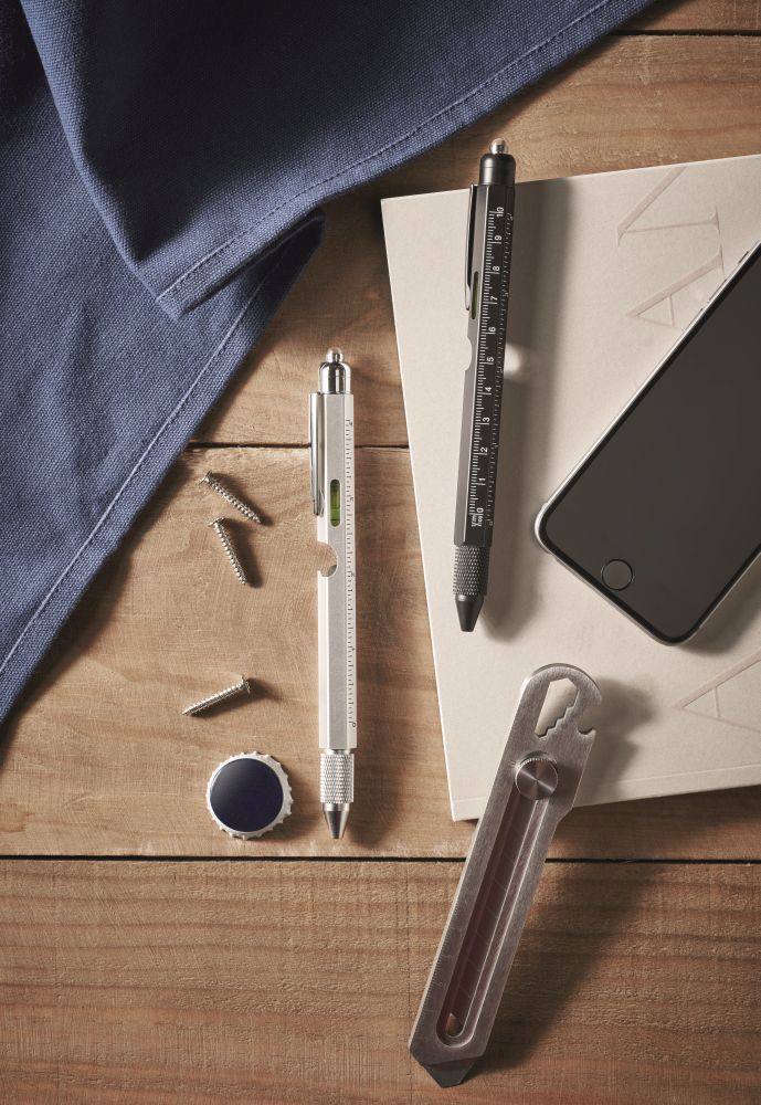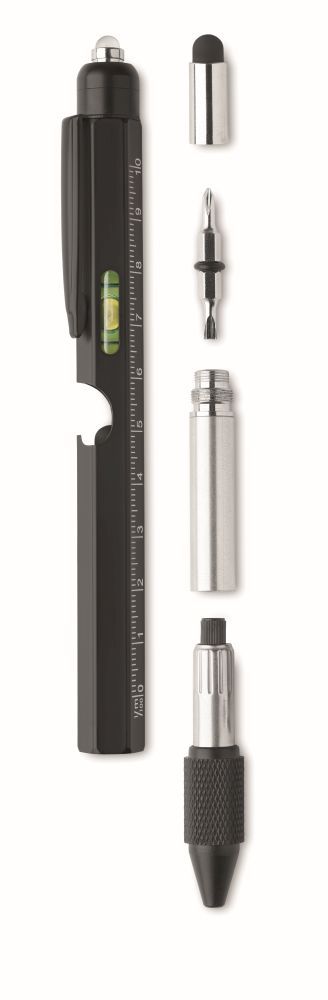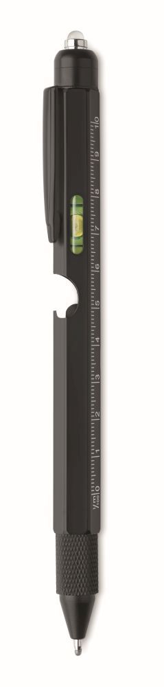 Propiska s vodováhou, pravítkem, stylusem, šroubovacími nástavci a LED světlem. Vyrobeno z recyklovaného hliníku. Součástí balení jsou 3 baterie AG. Modrý inkoust. Rozměry: 1,6x16cm