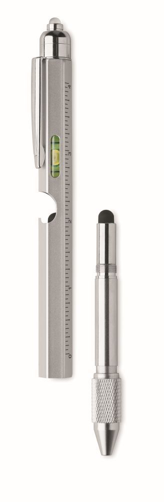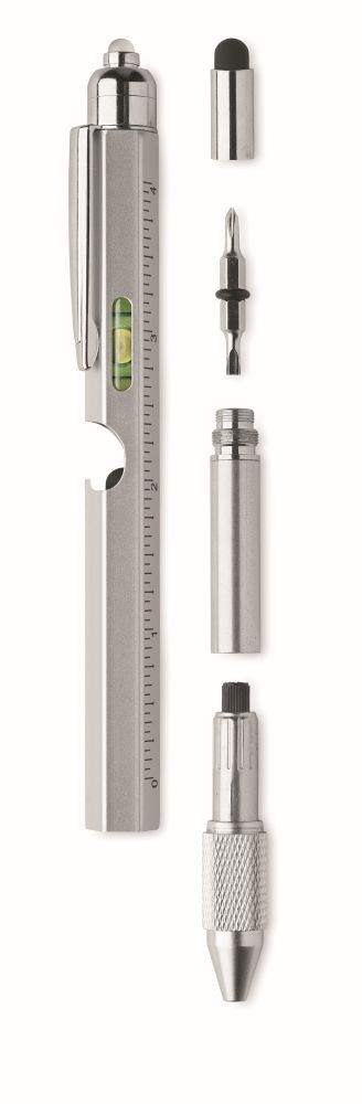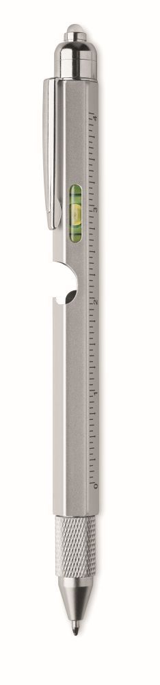 Propiska s vodováhou, pravítkem, stylusem, šroubovacími nástavci a LED světlem. Vyrobeno z recyklovaného hliníku. Součástí balení jsou 3 baterie AG. Modrý inkoust. Rozměry: 1,6x16cm