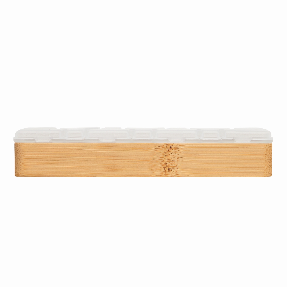 Krabička na pilulky se 7 samostatnými přihrádkami pro přesné denní dávkování, v bambusové krabičce. Rozměry: 12,7 x 4,9 x 2,3 cm