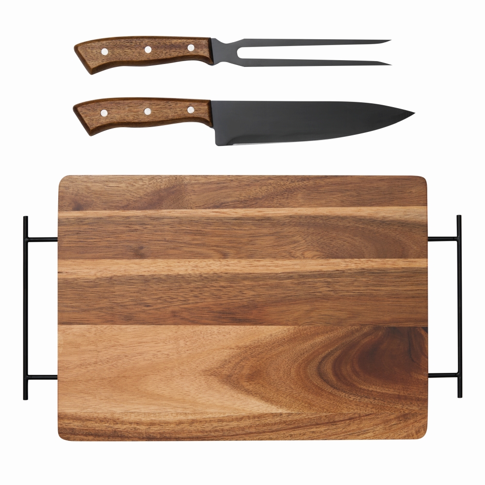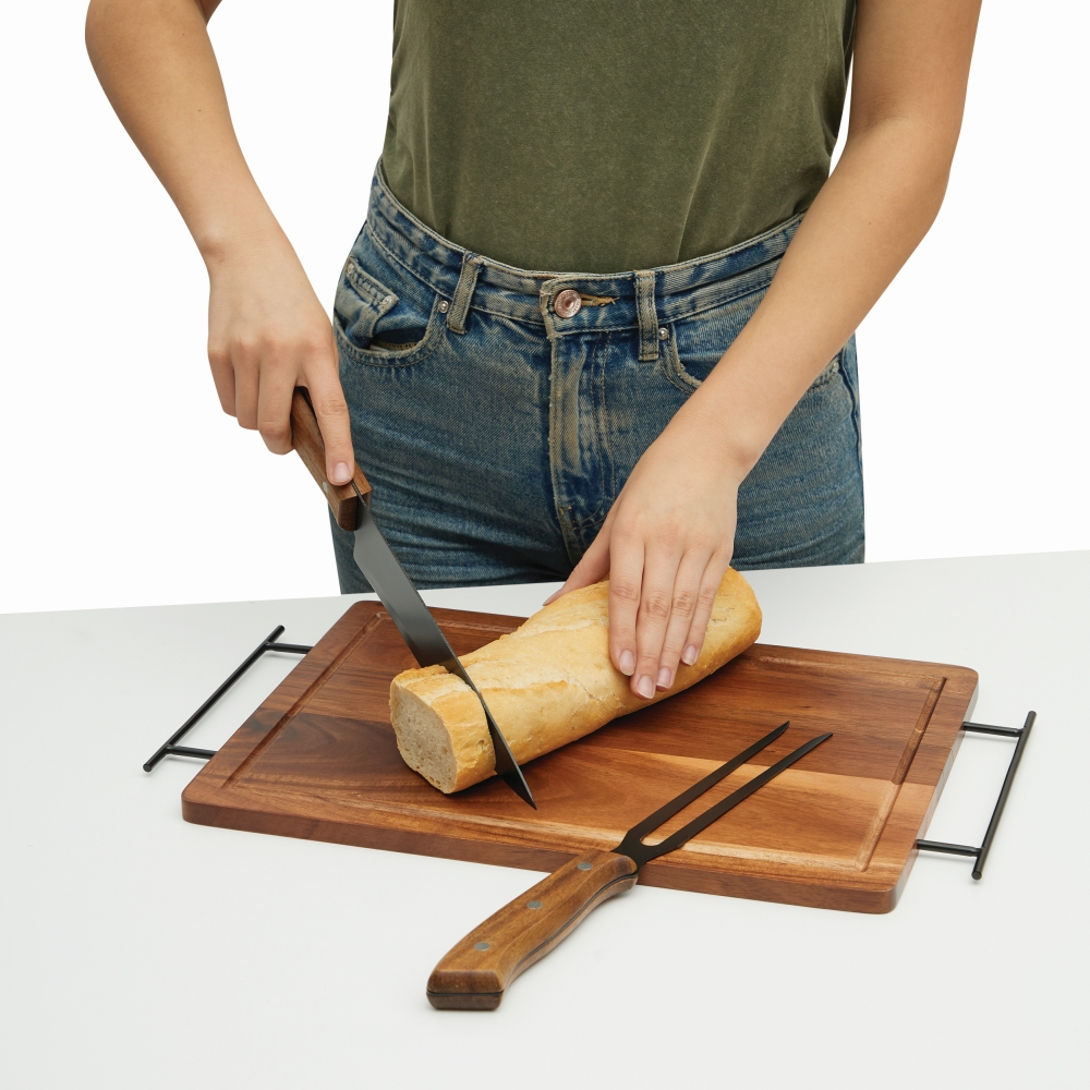 Krájecí prkénko včetně příboru, nůž a vidlička z nerezové oceli s rukojetí z akáciového dřeva, s praktickou drenážní drážkou na okraji a kovovými rukojeťmi. Rozměry: 43 x 26 x 1,2 cm
