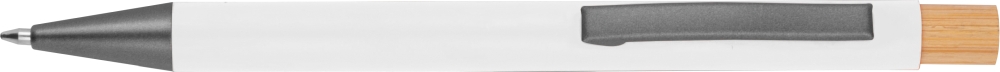 Kuličkové pero z recyklovaného hliníku s kovovým klipem, bambusovým tlačítkem a modrou náplní. Rozměry: O 1 × 14,2 cm.