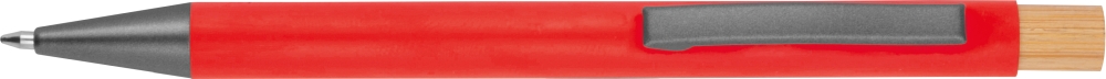 Kuličkové pero z recyklovaného hliníku s kovovým klipem, bambusovým tlačítkem a modrou náplní. Rozměry: O 1 × 14,2 cm.