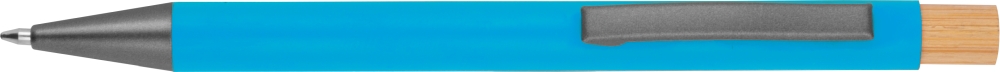 Kuličkové pero z recyklovaného hliníku s kovovým klipem, bambusovým tlačítkem a modrou náplní. Rozměry: O 1 × 14,2 cm.