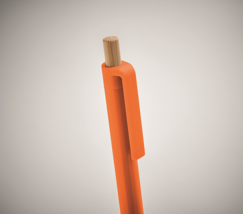 Propiska z recyklovaného ABS s bambusovým tlačítkem. Modrý inkoust. Rozměry: 13,4 x 1,5 x 1,1 cm