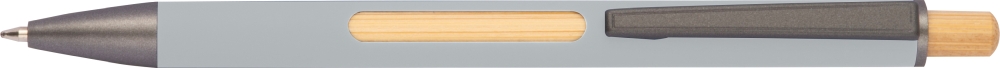 Kuličkové pero vyrobené z recyklovaného hliníku s černým kovovým klipem, modrou výplní, bambusovým knoflíkem a bambusovou vložkou ve výšce klipu. Rozměry: o 1 x 14,7 cm