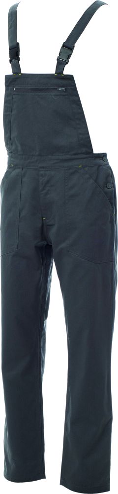Laclové kalhoty s širokou ochranou ledvin, elastické ramenní popruhy s přezkami s automatickým zapínáním, boční zapínání na knoflíky, zapínání poklopce na zip, elastický pas. Prošití dvojjehlou v rozkroku a na vnitřní straně nohavice, kapsa na hrudi s pružným pouzdrem na jmenovku a zapínání na zip, dvě přední kapsy a kapsa na tužku, pravá postranní kapsa na svinovací metr a zadní kapsa na uzavírací klopu na suchý zip. Materiál 100 % bavlna.
