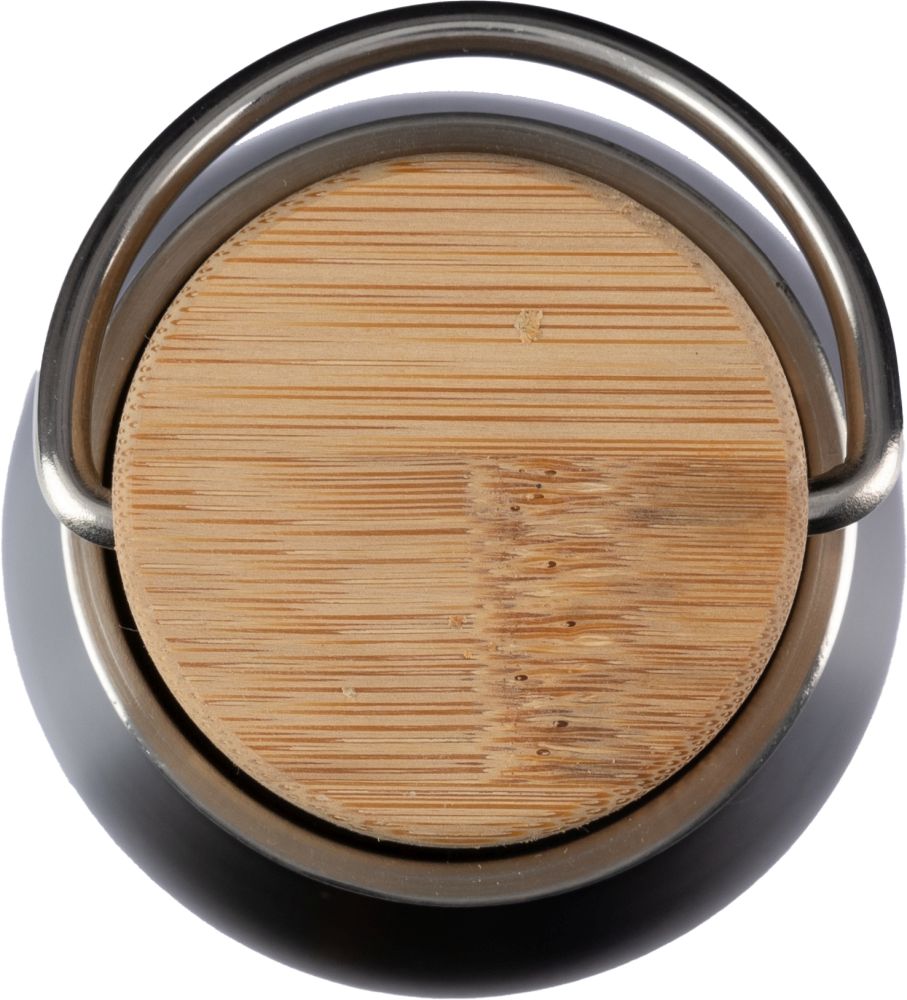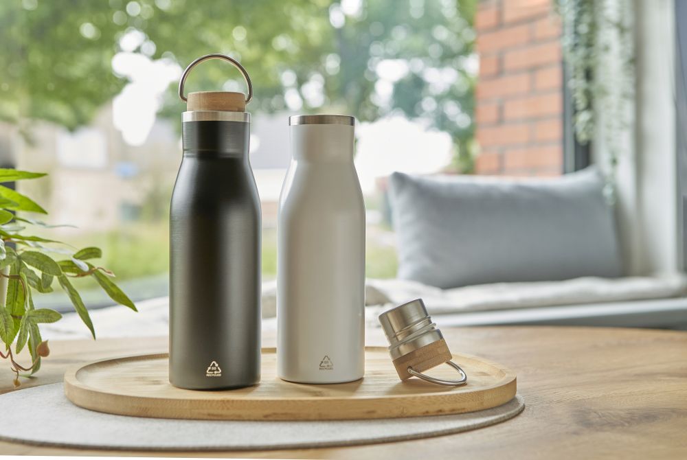 Láhev na pití z recyklované nerezové oceli s bambusovými detaily ve víčku a poutkem na přenášení. Nerezová ocel 304 uvnitř a nerezová ocel 201 venku. Obsahuje logo z recyklované nerezové oceli na láhvi. Baleno po kusech v hnědé kartonové krabici. Materiál: nerezová ocel Rozměry: 7,2 x 22,6 cm