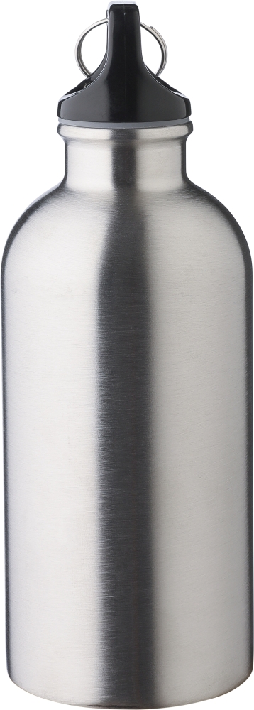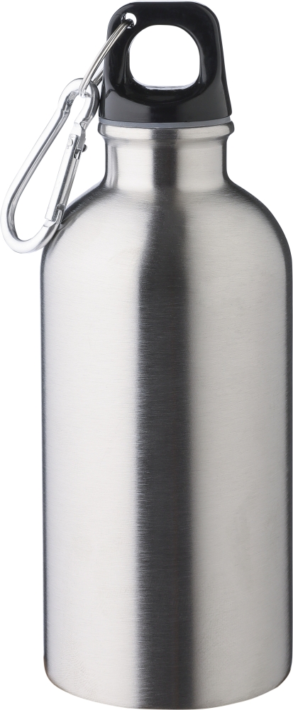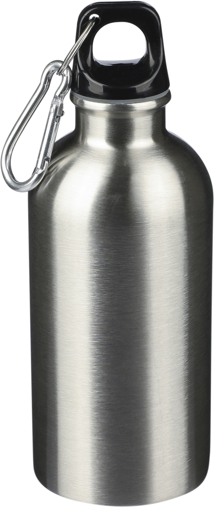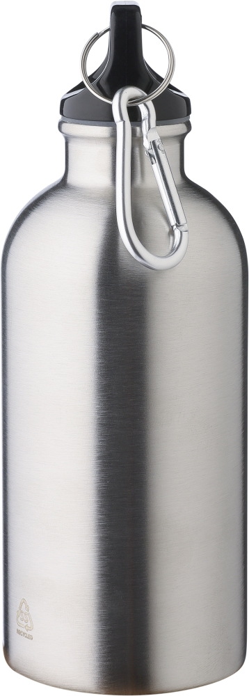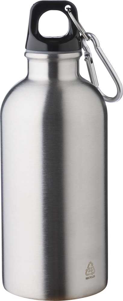 Jednostěnná láhev z recyklované nerezové oceli s objemem 400 ml, PP víčkem a stříbrnou hliníkovou karabinou. Na přední straně má recyklované vyryté logo. Výška: 17,5 cm