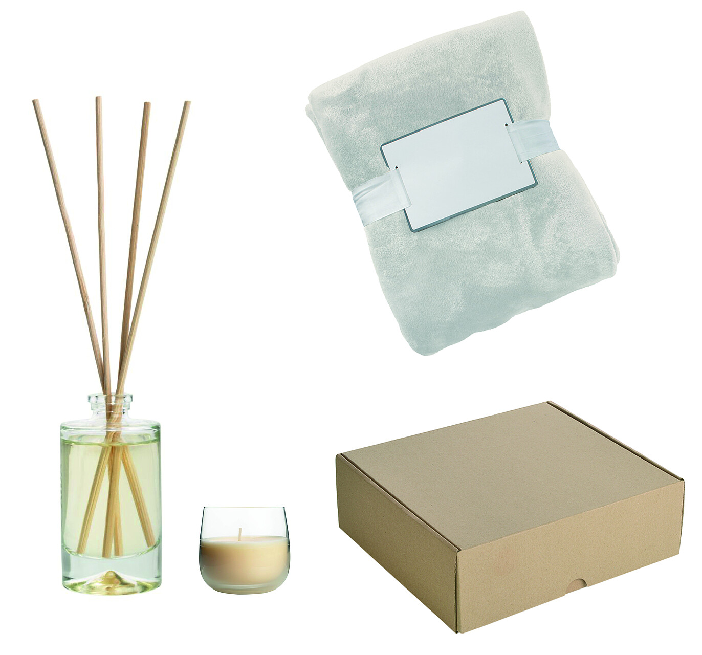 Dárková sada obsahuje fleecovou deku o rozměru 120 × 150 cm, kterou lze vyšít Vaším logem. Dále sada obsahuje vonný difuzér s vůní spa garden a vonnou svíčku s vůní vanilky. Difuzér i svíčku lze potisknout tampontiskem T3 ve velikosti 20 × 20 mm. Dárkovou krabici lze potisknout sítotiskem jednou barvou přes celé horní víko. Nebo s dodacím termínem 3–4 týdny lze krabici celoplošně plnobarevně potisknout, s minimálním odběrem 50 kusů. Rozměry: 37 × 34 × 11 cm.