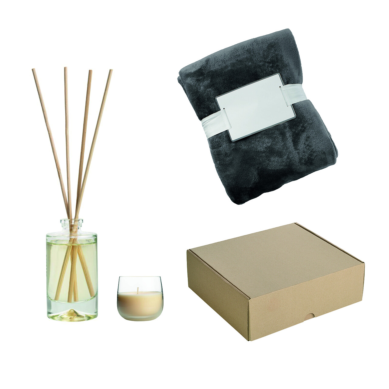 Dárková sada obsahuje fleecovou deku o rozměru 120 × 150 cm, kterou lze vyšít Vaším logem. Dále sada obsahuje vonný difuzér s vůní spa garden a vonnou svíčku s vůní vanilky. Difuzér i svíčku lze potisknout tampontiskem T3 ve velikosti 20 × 20 mm. Dárkovou krabici lze potisknout sítotiskem jednou barvou přes celé horní víko. Nebo s dodacím termínem 3–4 týdny lze krabici celoplošně plnobarevně potisknout, s minimálním odběrem 50 kusů. Rozměry: 37 × 34 × 11 cm.