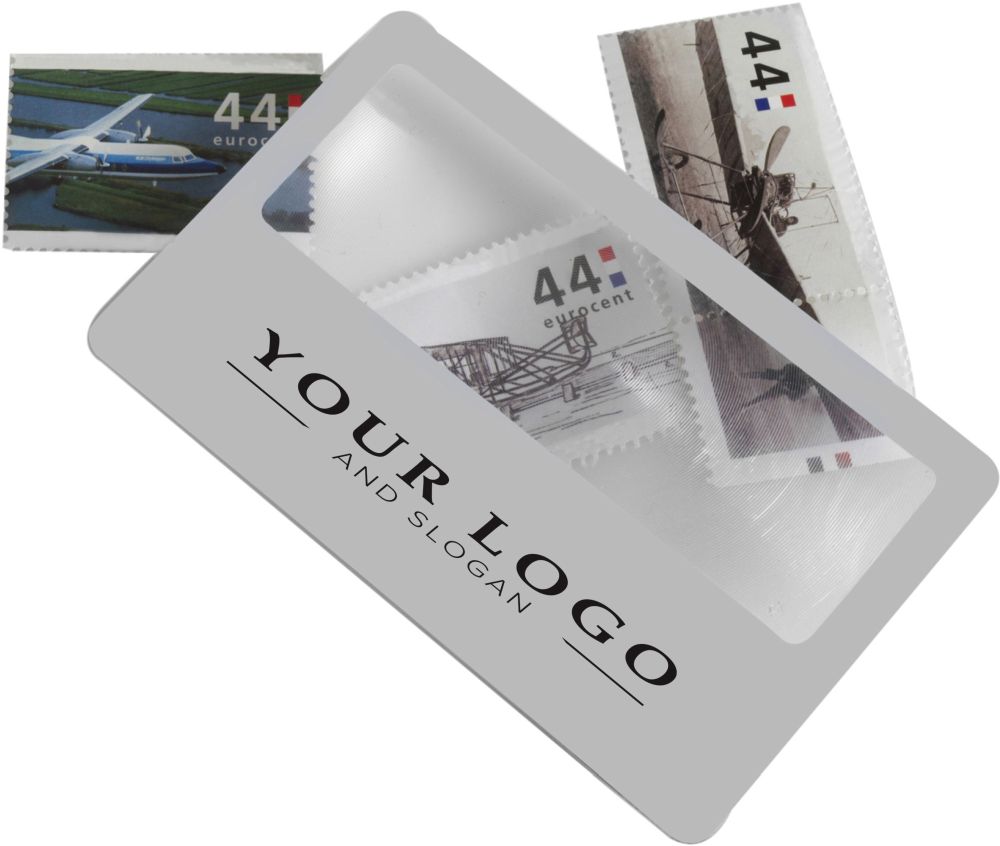 Tenká plastová kartička o velikosti kreditní karty s lupou. Rozměry 8,5 x 5,5 x 0,01 cm. Bílá barva.