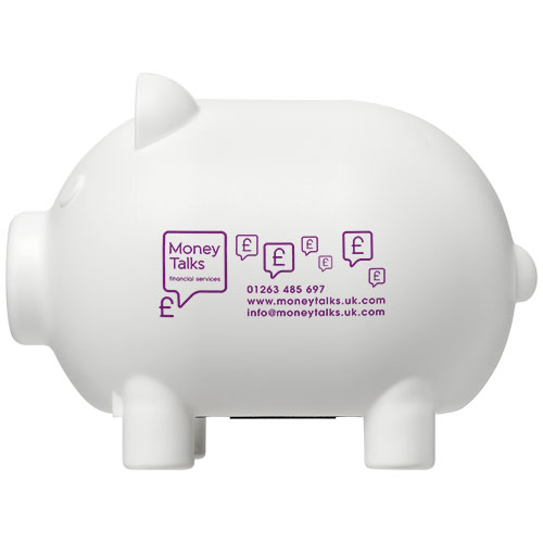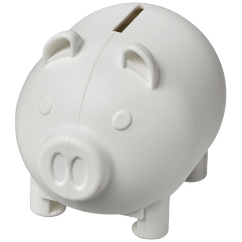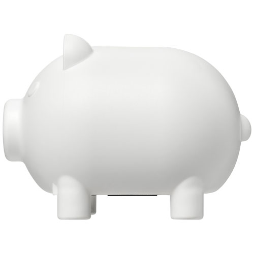 Pokladnička prasátko, vyrobené z plastu. S dírkou pro vhazování peněz na hřbetu. Rozměry: 11,4 x 8,5 x 7 cm