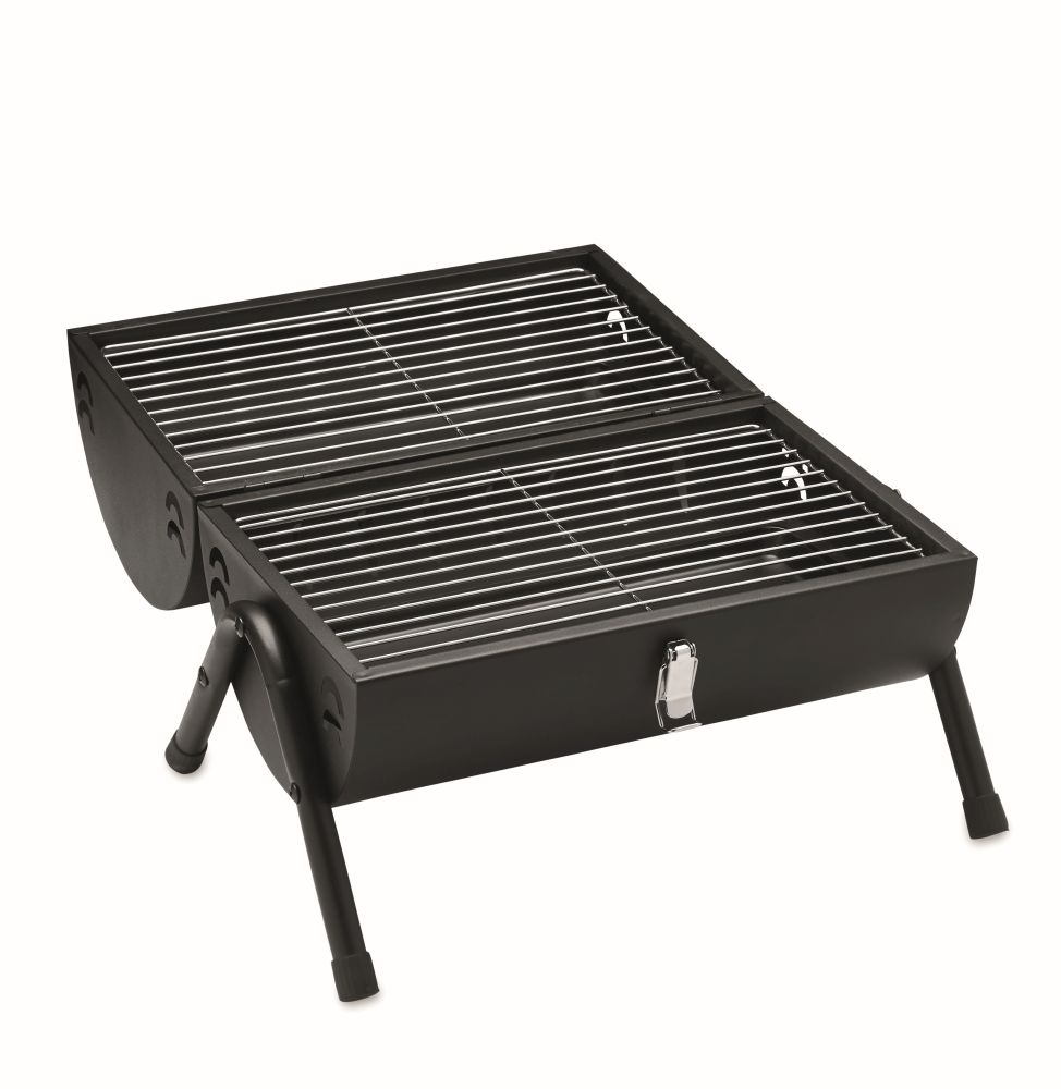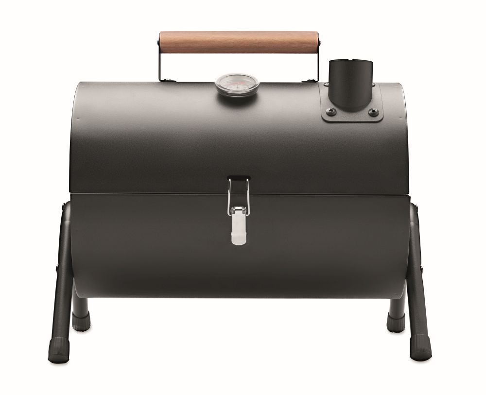 Přenosný grilovací sud ze železa s komínkem a ukazatelem teploty. Černý práškový nástřik. Dřevěné držadlo na přenášení Rozměry: 37x29x37cm