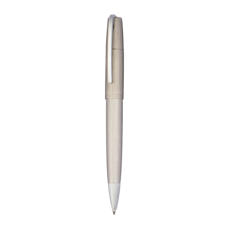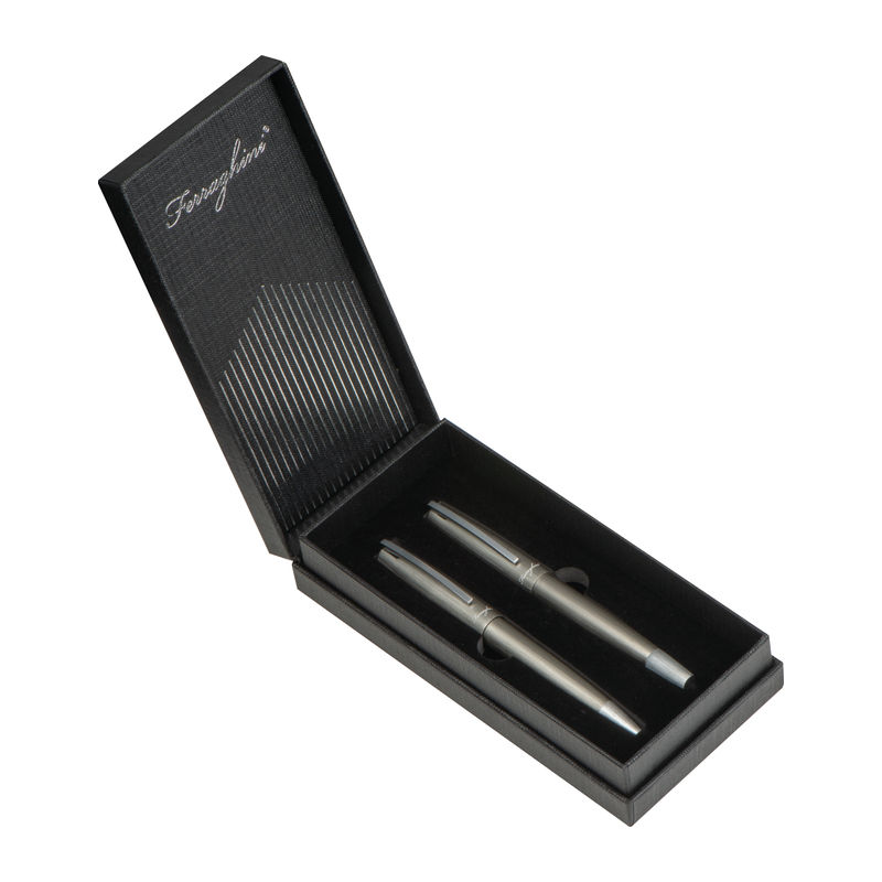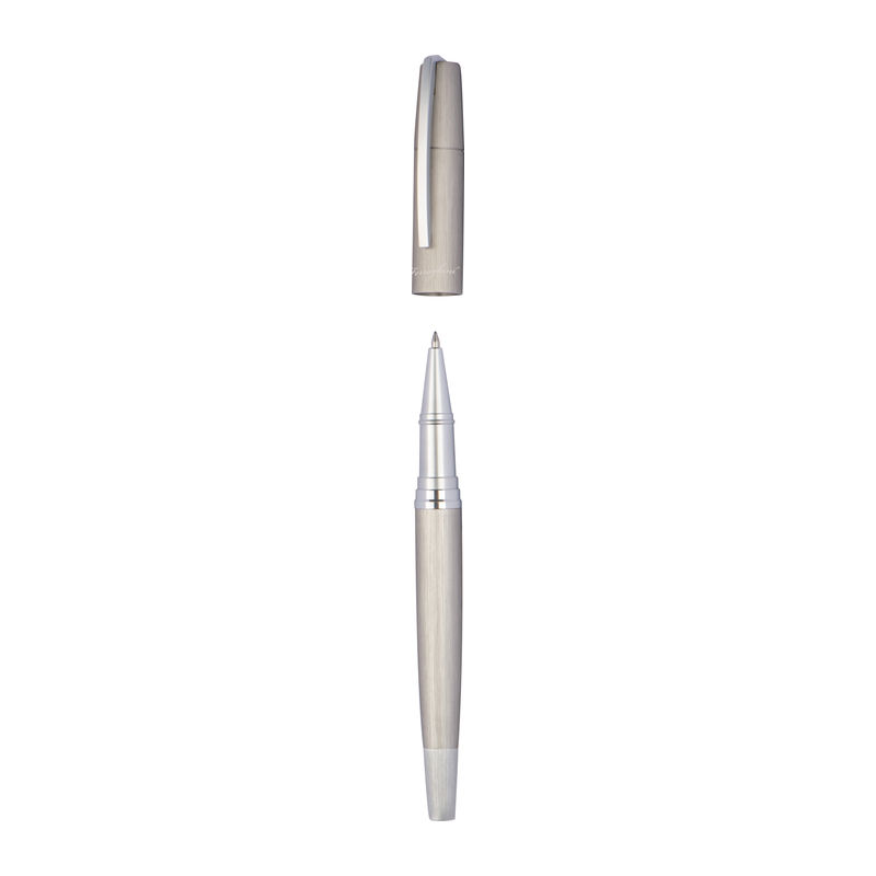 Psací sada z elegantního matného broušeného kovu. Set se skládá z kuličkového pera a rolleru s modrou náplní. Rozměry: 18,1 x 8,6 x 3,7 cm.
