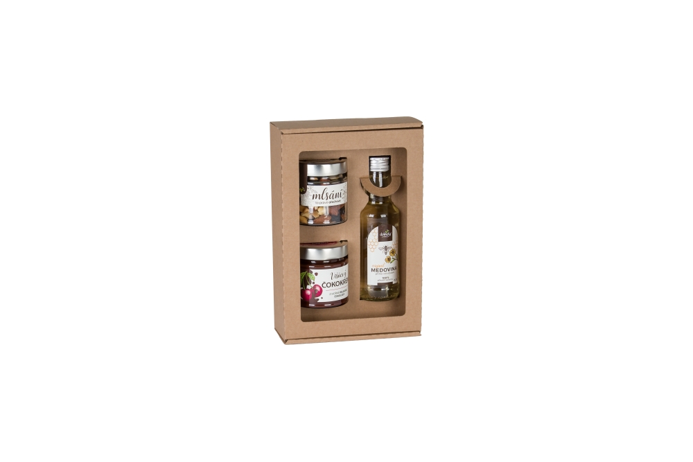Dárková sada obsahuje Medovinu originál 0,2 l, čokokrém višeň 200 g a ořechové mlsání mix natural 100 g. Minimální odběr: 9 ks. Termín dodání: 10 dnů. Rozměry: 26 × 17 × 7,5 cm.