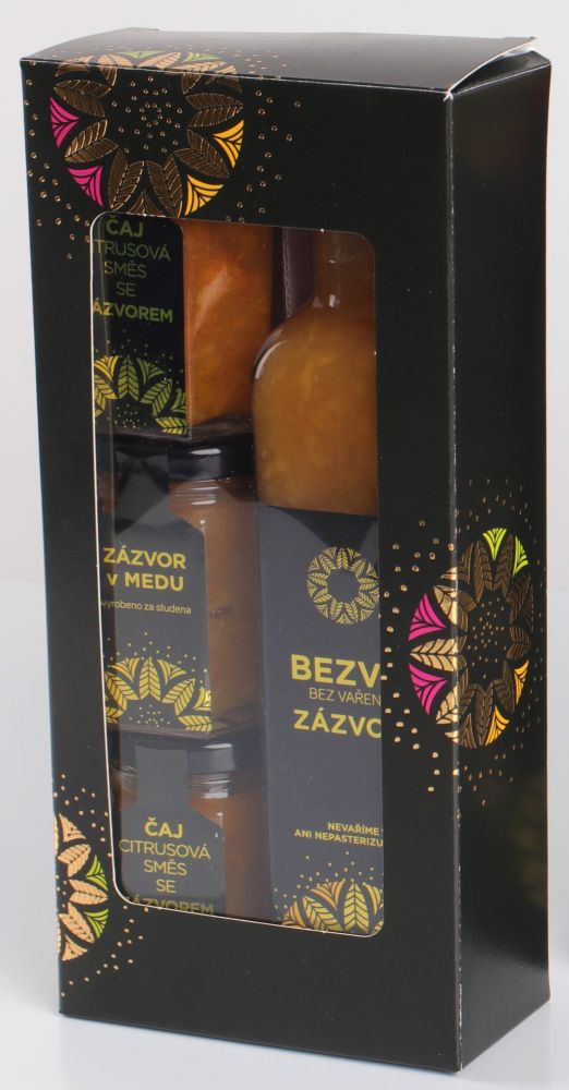 Zázvorová sada obsahuje „Bezva zázvor“ – ovocný nápojový koncentrát pro přípravu nealkoholického horkého nebo studeného nápoje 0,25 l, 2 ks šťavnatý čaj citrusová směs se zázvorem 55 ml a zázvor v medu 66 g. Rozměry: 22 × 10 × 5 cm.