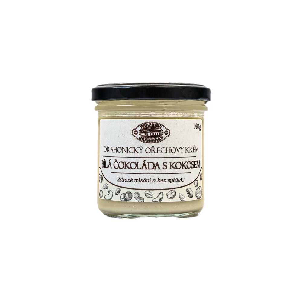Ořechový krém kokos & bílá čokoláda 140 g. Kombinace kokosu a lahodné bílé čokolády Vám jednoduše nedá spát! Doporučená technologie tisku samolepka nebo vlastní etiketa. Minimální množství: 30 ks. Rozměry: 7 × 7 × 5,5 cm.