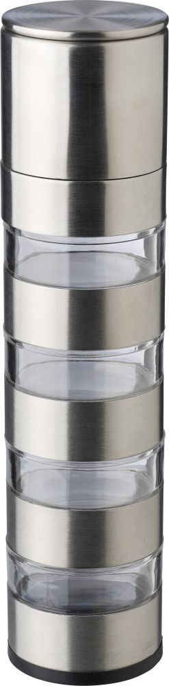Mlýnek na koření se 4 dózičkami na koření. Dózy jsou z nerezu, mlecí mechanismus je keramický. Každý kus je balen v hnědé kartonové krabičce. Rozměry: O 5.2 cm