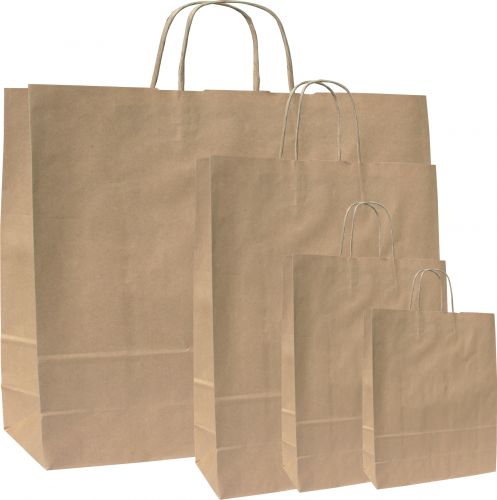 Hnědá papírová taška z EKO papíru, hnědé kroucené držadlo. Rozměry: 32 × 13 × 42,5 cm.