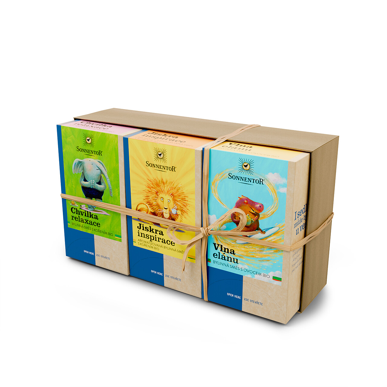 Chvilka relaxace - jemná bylinná směs s kořením z meduňky a levandule. Složení je meduňka bio 32%, levandule bio 22%, šalvěj bio, fenykl bio 11%, petržel bio, měsíček květ bio. Vlna elánu - vyvážená bylinná směs s ovocem. Složení je yzop bio, máta kadeřavá bio, fenykl bio, šípek bio 10%, heřmánek bio. Jiskra inspirace - aromatizovaná bylinná směs s kořením. Složení je fenykl bio, koriandr bio 20%, anýz bio 10%, lékořice bio, meduňka bio, skořice bio 10%, zázvor bio, máta peprná bio, chrpa květ bio, vanilka bio. Rozměry: 8,5 x 21,6 x 12,5 cm