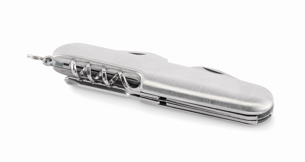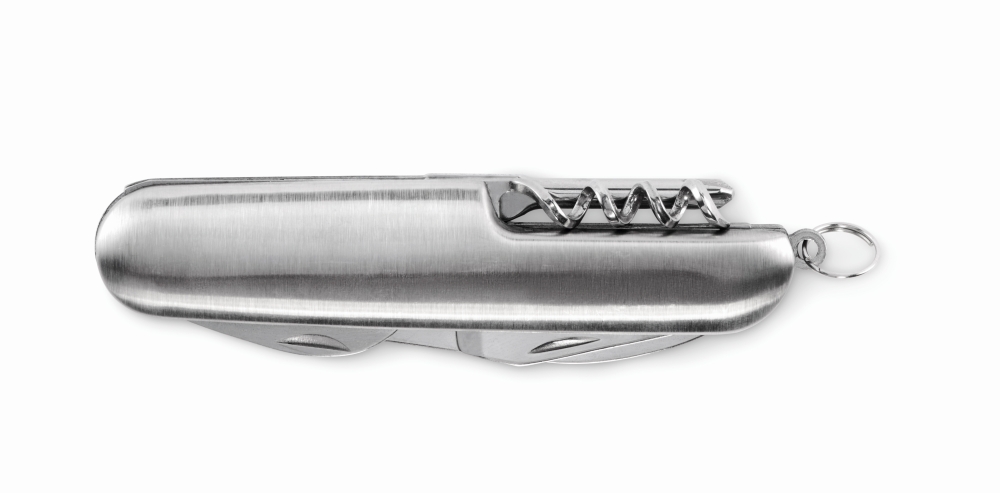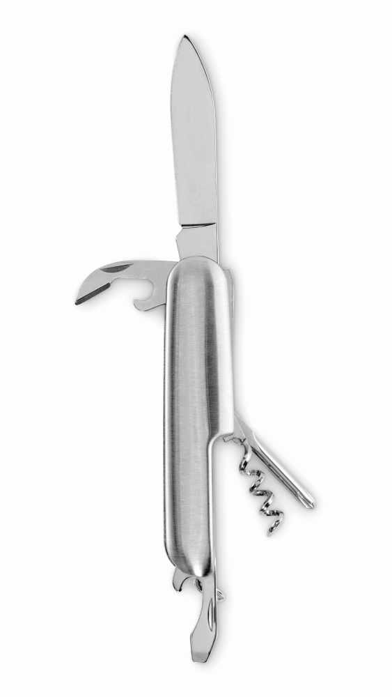 Multifunkční kapesní nůž z recyklovaného hliníku. 5 funkcí: nůž, otvírák na lahve, šroubovák, vývrtka a otvírák na konzervy. Rozměry: 8,5 x 2,5 cm