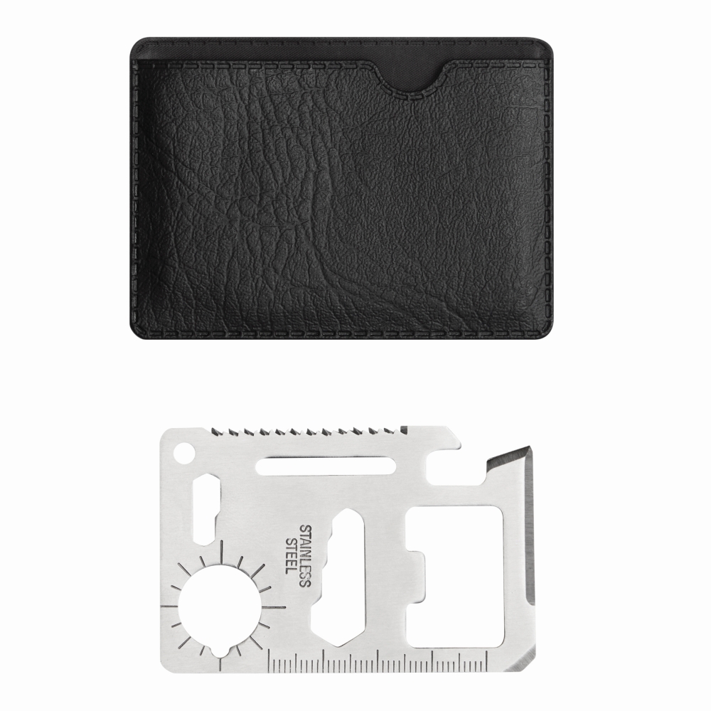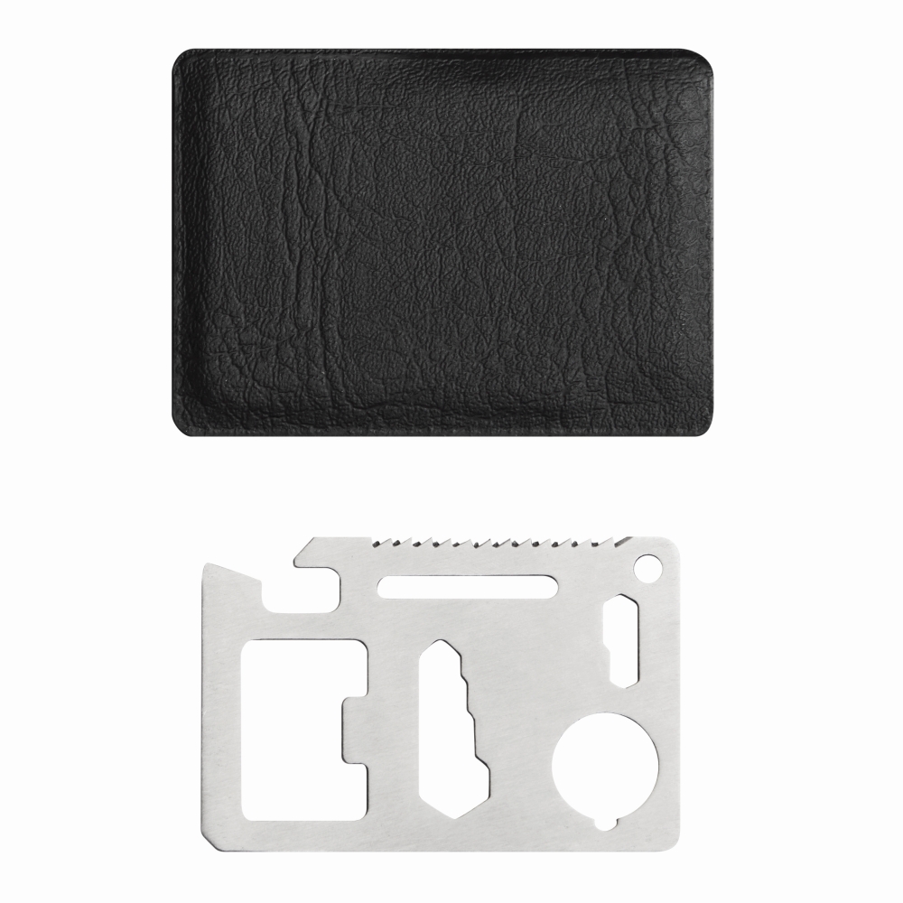 Multifunkční karta s 11 funkcemi, jako je otvírák na konzervy, nůž, šroubovák, pravítko, otvírák na láhve, klíč na různé matice a hlavy šroubů, dodáváno v PU pouzdru. Rozměry: 7 x 4,5 x 0,1 cm
